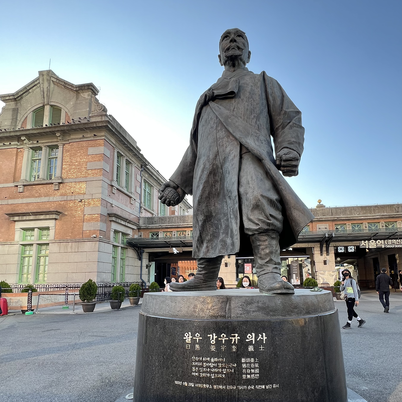 서울역 정초석 왼쪽에 새겨진 3대 조선 총독 사이토마코토의 이름을 훼손한 그 누군가의 마음을 응원하고 싶다. 오른손에 수류탄을 쥐고 서울역 광장에 서 있는 강우규 의사의 동상도 눈으로 쓰다듬어 본다. 경의중앙선 플랫폼 사이에 파란색 지붕의 창고가 있는데, 조선통운창고였던 이곳에서 최초 우리말 사전의 초석이 된 말모이 원고가 발견되었다고 한다. 그러고 보니 서울역은 단순한 생활 공간만은 아니었나 보다. 우리가 잊지 말아야 할 역사를 담고 있는 소중한 유산이었다.