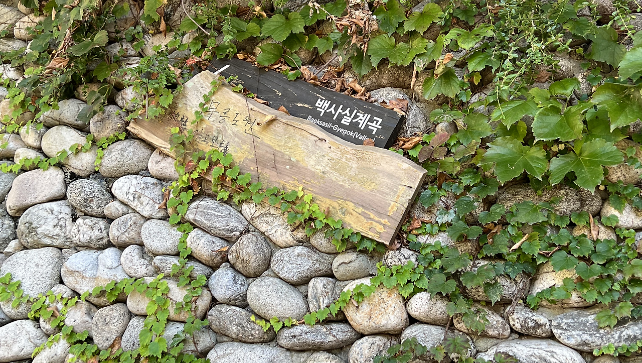마을길 따라 한참을 걸어가니 오르막 계단이 나왔다. ‘무릉도원’이라는 부제가 붙은 ‘백사실 계곡’ 안내판이 돌담과 함께 정겨웠다.