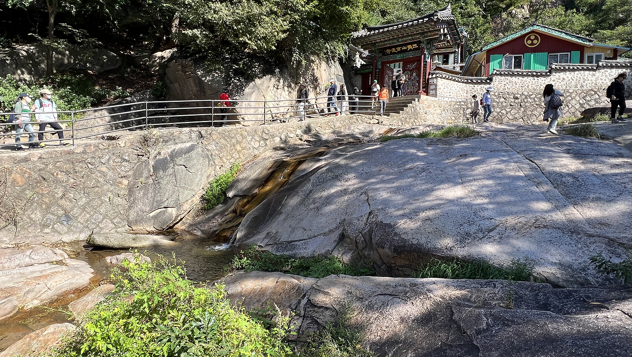 그 마을이 끝나는 곳에 현통사가 있었다. 현통사 앞 너럭바위는 압도할 정도로 넓었다. 그러나 물줄기는 너무나 미약해서 폭포라고 할 수도 없었다. 만약에 물이 더 많이 흐른다면 훨씬 웅장한 모습일 거라는 상상을 해본다.