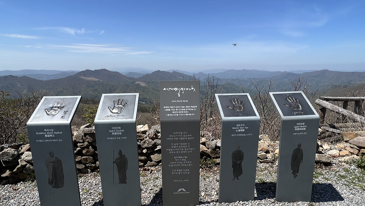 숲길이 시작하는 곳에 지난 2016년의 ‘세계명상대전’ 때 ‘하늘길’을 다녀간 유명한 명상가 네 명의 핸드프린팅과 안내문이 서 있었다. 그들은 어떤 마음으로 이곳을 바라봤을까? 자연 속에서 호흡하면서 걷는 게 명상이라고 생각하는 나로서는 그들의 심오한 명상 세계를 이해하기는 어려울 것 같다.