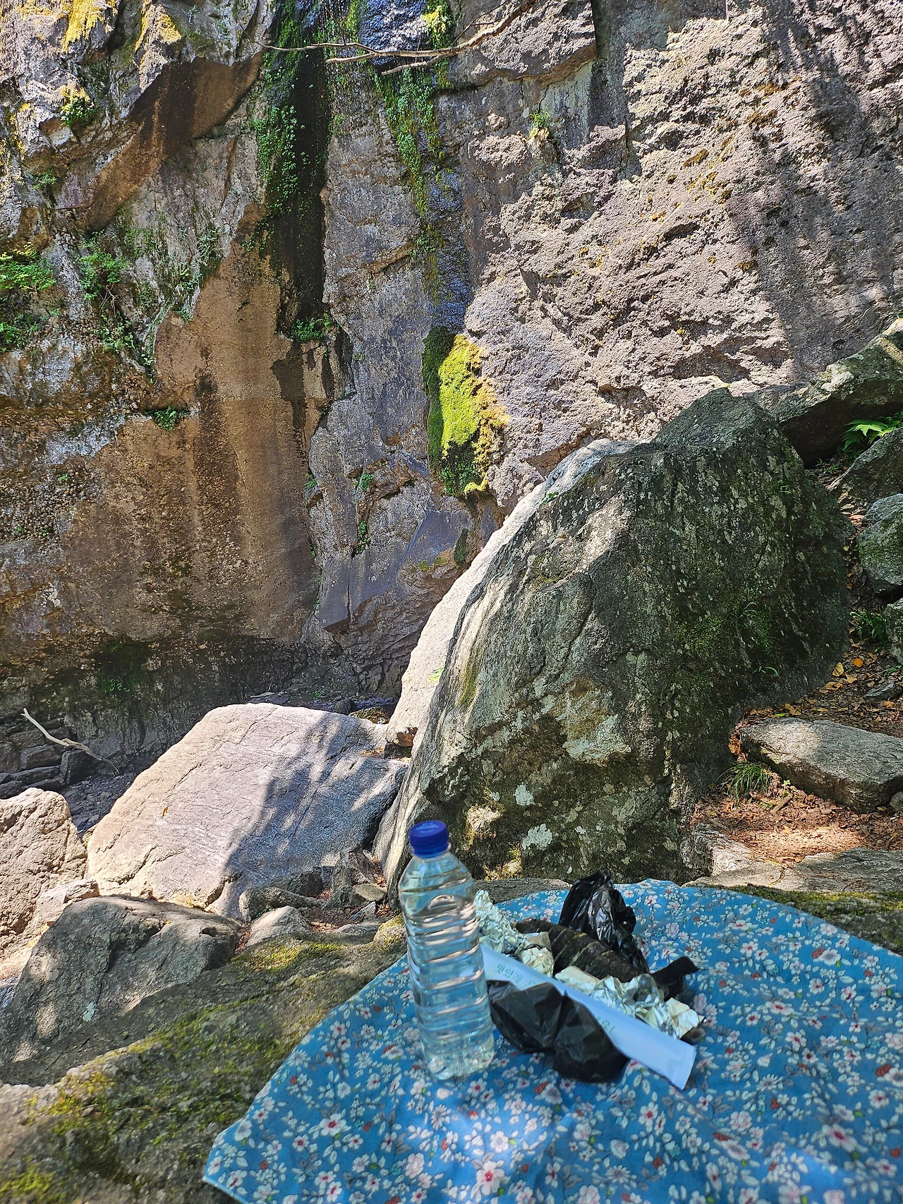 사찰에서 조금 더 걸어서 대혜폭포가 있는 곳까지 올랐다. 그곳에는 저마다 휴식을 취하고 있는 사람들이 있었다. 폭포는 가벼운 빗줄기처럼 흘러내리며 잠시 웅장함을 감추고 있었다. 그래도 자연 폭포를 한 폭의 그림 보듯이 바라봤다. 바위에 앉아서 여유롭게 김 밥 한 줄을 먹었다.