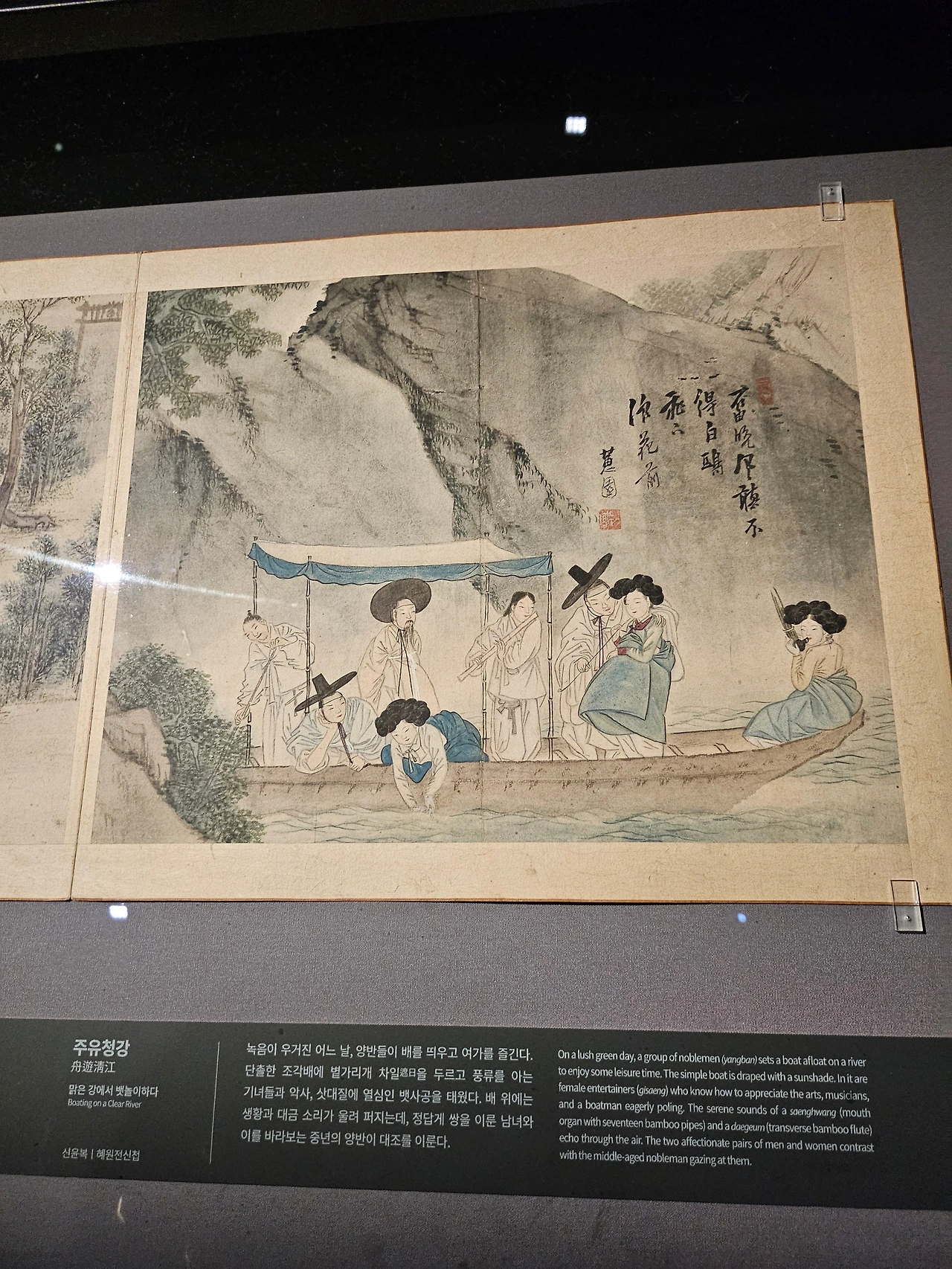 미리 공부했던 김홍도, 신윤복 그리고 김득신의 작품은 눈에 들어왔지만 그 나머지 전시품들은 얕은 시선으로 감상할 수밖에 없었다. 청자를, 추사 김정희의 서체를, 정선의 작품들을 보면서도 감흥을 못 느꼈다. 아는 것이 없어서였을 것이다. 그럼에도 전시장을 둘러보면서 관람을 마치고, 아쉬움이나 부족함을 크게 느끼진 않았다. (그저 관람객이 많아 구석구석 작품을 감상하지 못한 점이 미련에 남았다. 화가 정선의 작품관도 사전에 알아보고 갔으면 좀 더 좋았겠다 정도?)