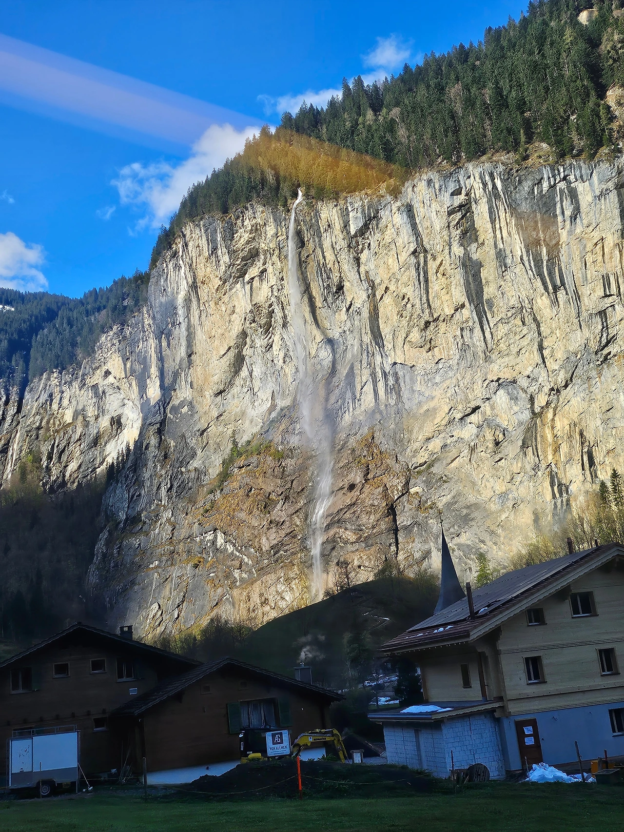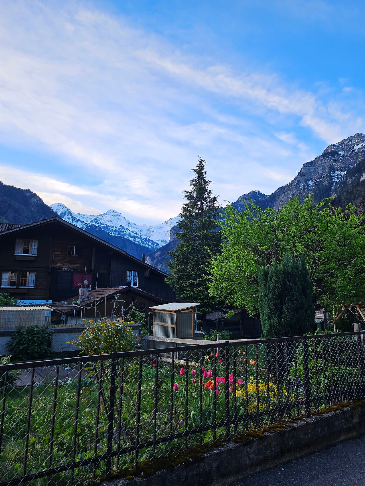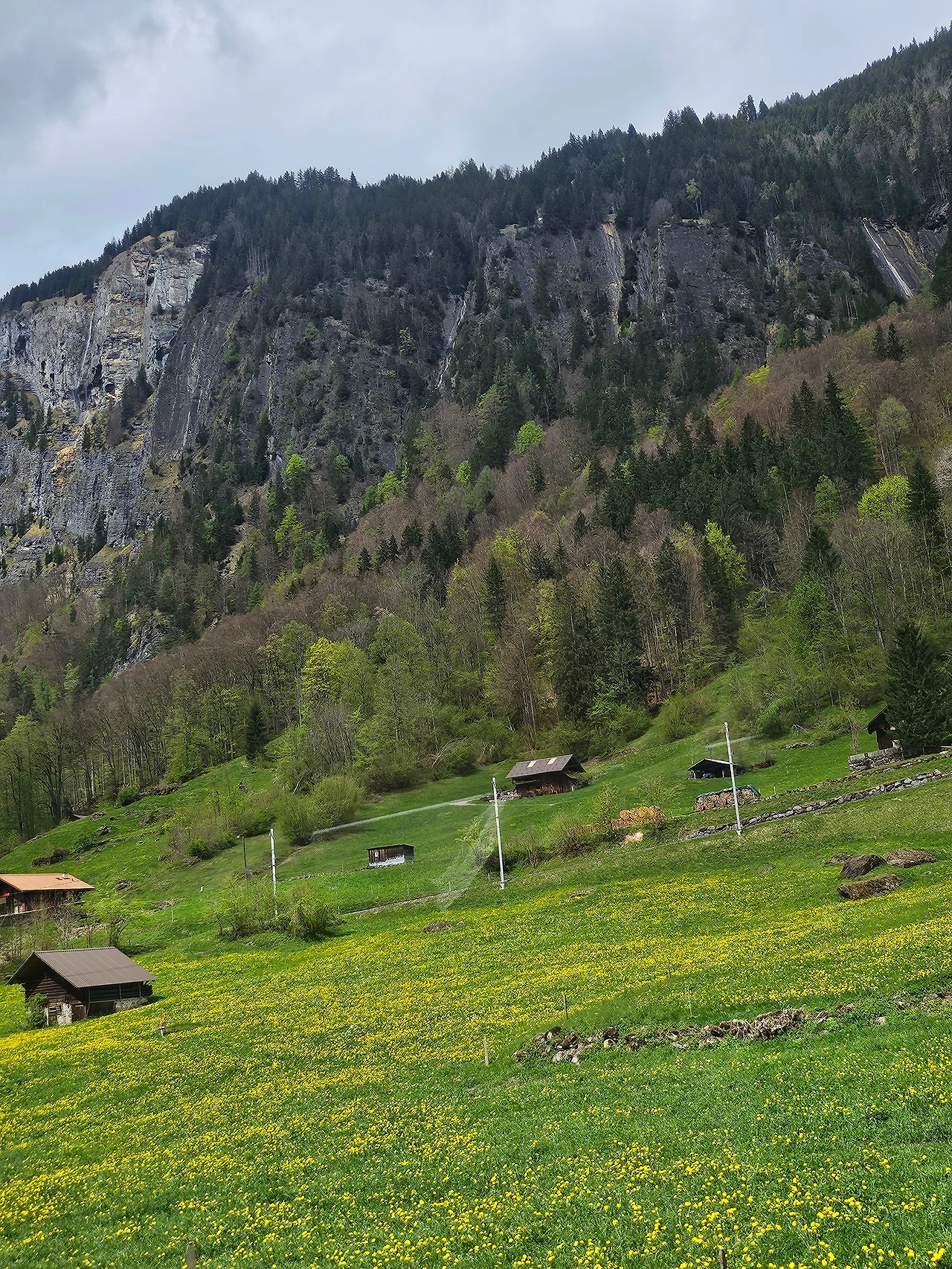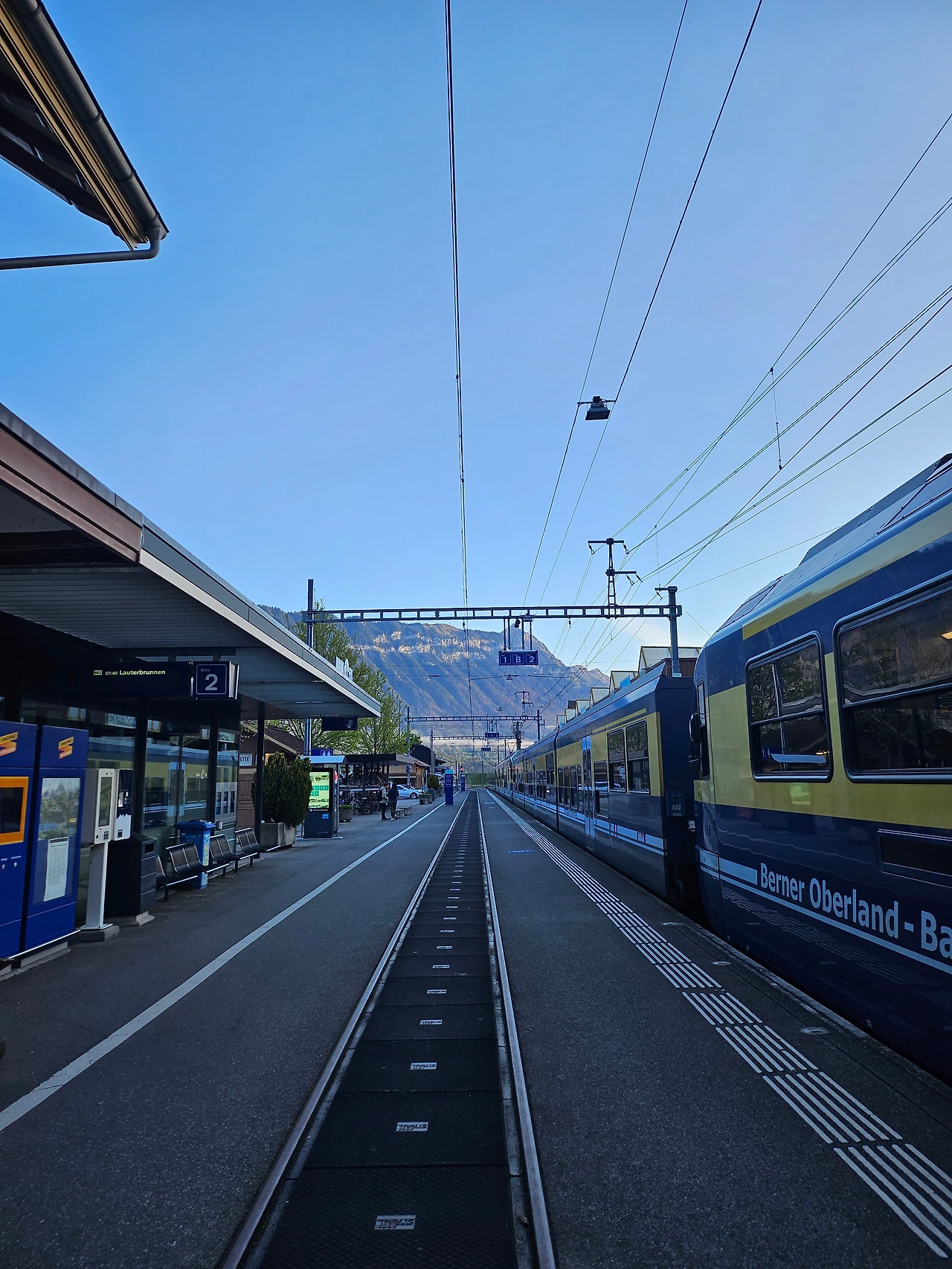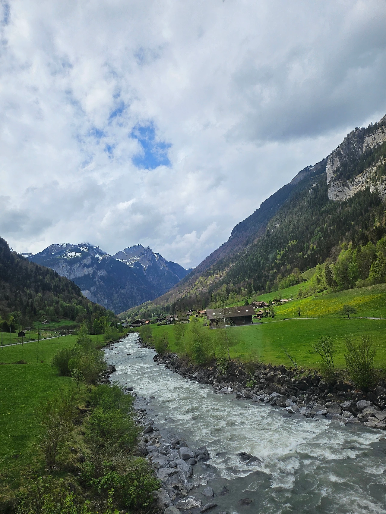 열차를 다시 타고, 중간에 내려 산악열차에 탑승했다. '스위스' 열차 여행하면 떠오르는 이미지가 창 밖 너머로 보였다. 맑은 하늘, 설산, 폭포 물줄기, 푸른 들판, 계곡에서 카약 하는 사람들···, 한적한 자연 그대로의 풍경이었다.