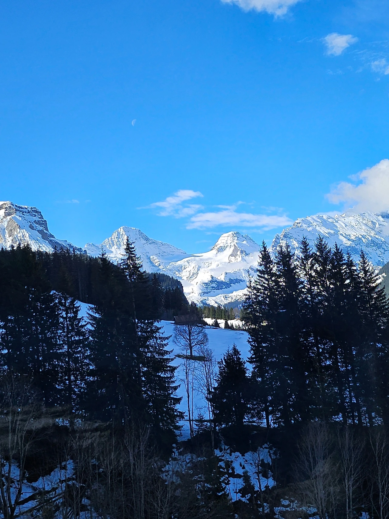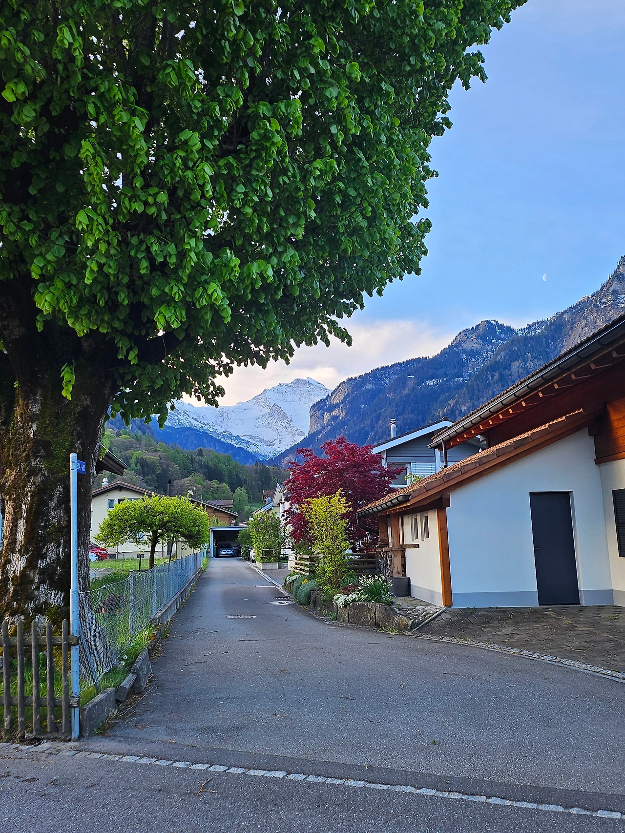 기차역까지 10분 정도밖에 되지 않아서 천천히 걸어내려갔다. 저 멀리 눈 덮인 하얀 산이, 대낮의 달이 보이고, 가까이에는 알록달록한 나무들이 한 폭의 그림같이 어울려 있었다. 여기는 이런 풍경이 일상일 '스위스'고, 이곳을 배경 삼아 걷고 있다는 사실은 일상에서 완전히 벗어나 '내가 선택한 장소에 잘 왔다'는 기분을 선사했다.