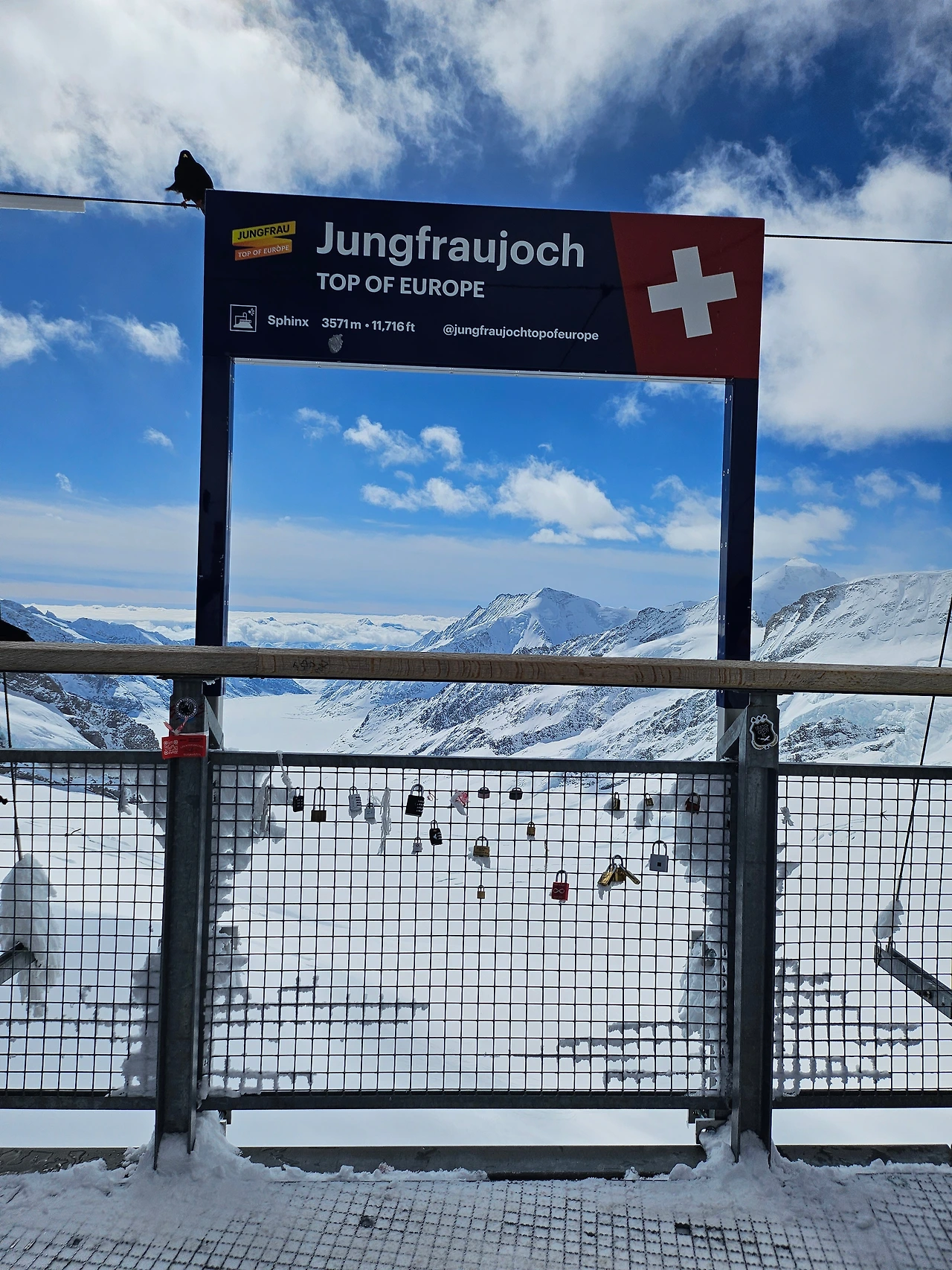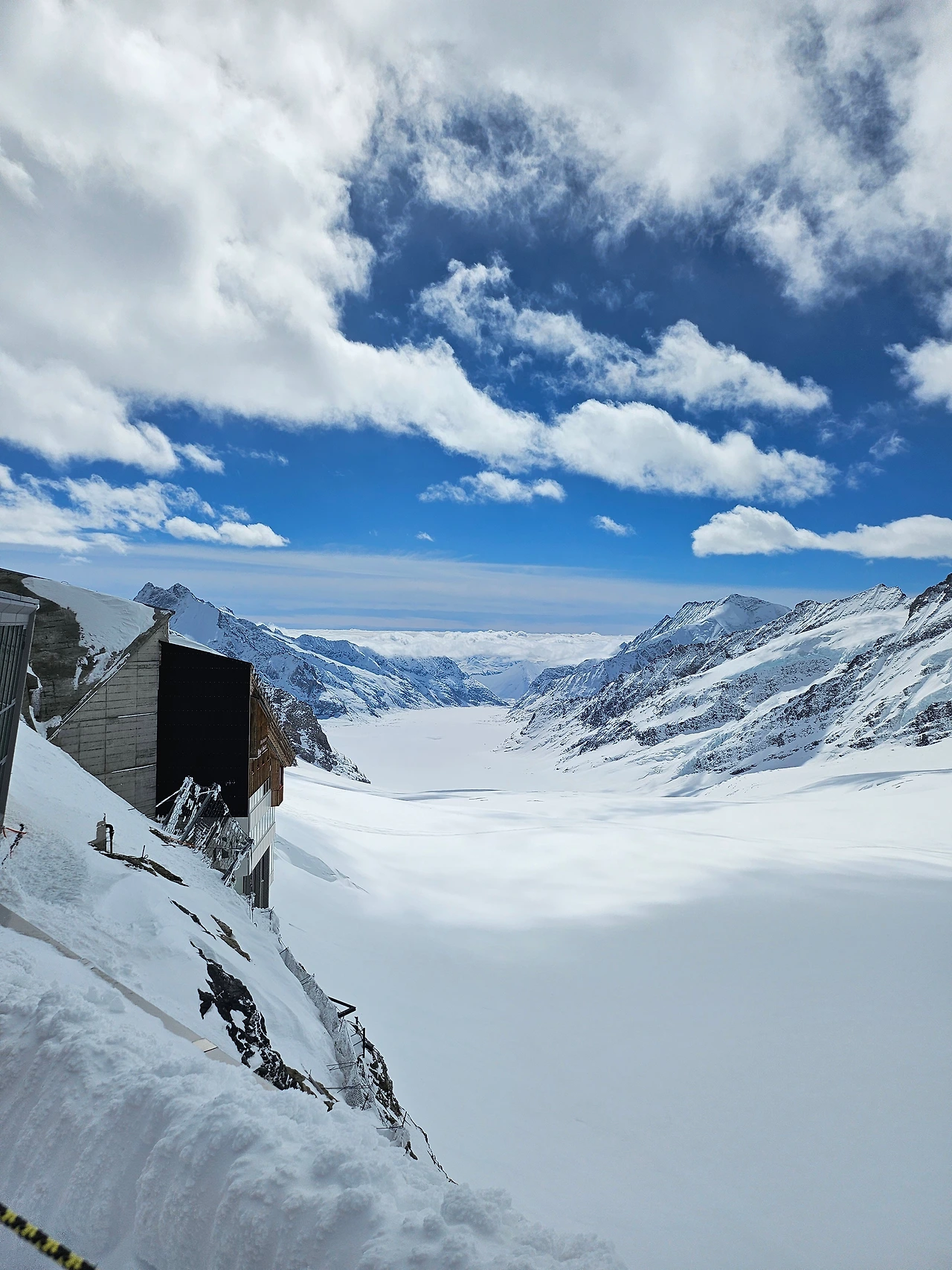 환승해서 융프라우요흐 열차를 타고 가파른 산을 올라 '유럽의 지붕'이라 불리는 융프라우 정상에 도착했다. 얼음궁전이라 부르는 곳을 먼저 관광하고, 스핑크스 전망대로 올라갔다. 햇살에 한 번, 새하얀 눈에 한 번 더 눈이 부셨다. 빙하와 알프스산군이 파라노마처럼 눈앞에 펼쳐졌다.