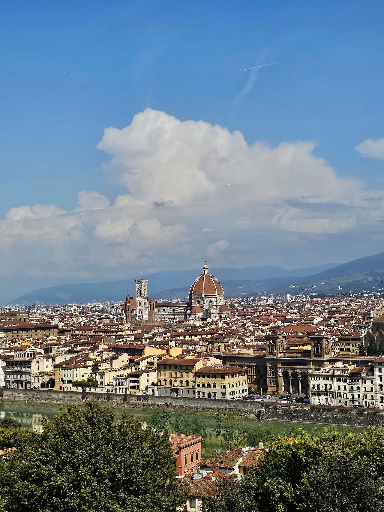 영화의 여운이 남을 때쯤, ost 음악과 스토리가 입혀진 피렌체에 도착했다. 버스에서 내려 미켈란젤로 광장을 둘러봤다. 높은 언덕 위의 광장이라 전경이 한눈에 내려다보였다. 우뚝 솟은 두오모가 반갑게 느껴졌다. 새하얀 뭉게구름과 도시 전체의 색감이 참 잘 어울렸다.