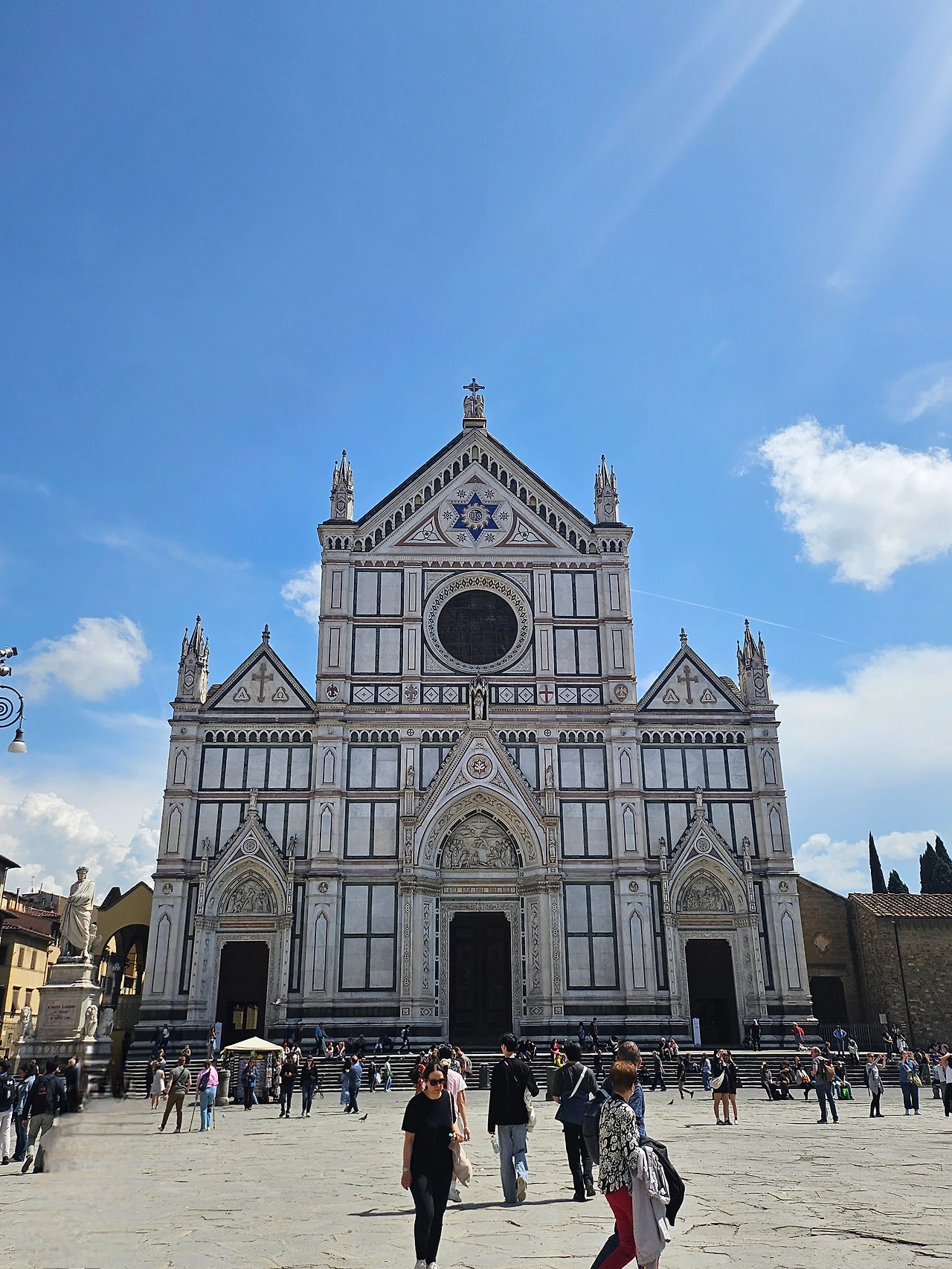 피렌체 투어를 마무리하면서 마지막으로 '피렌체 산타 크로체 성당' 광장에서 잠시 시간을 보냈다. 그냥 지나칠 법한 성당이지만, 가이드님 설명에 의하면 이곳 내부 지하에는 미켈란제로, 마키아벨리, 갈릴레오 갈릴레이 등 피렌체 출신 유명 인사의 무덤이 있다고 한다. 특히 미켈란젤로는 피렌체를 너무 사랑해서 꼭 피렌체에 있는 성당에 묻히고 싶다는 말을 남겼다고 한다.