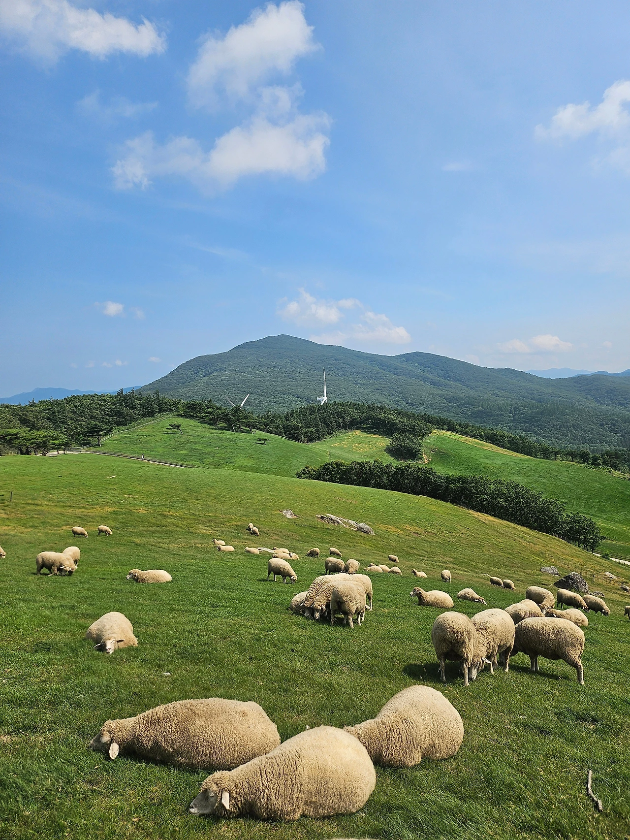 점심은 축협대관령한우타운에서 소고기를 먹었다. 그리고는 근처에 대관령양떼목장이 있어서 잠시 들렀다. 햇볕을 이겨내고 언덕 끝까지 올랐더니 어느샌가 바람이 불어왔다. 덕지덕지 양 떼들이 풀을 뜯어먹고 있었다. 탁 트인 시야에 흰색, 하늘색, 그리고 초록색이 채워졌다. 평소 눈에 담을 수 없는 풍경을, 그런 자연을 감상했다. 일상이 무채색이라서 여행을 하는 건가 보다.