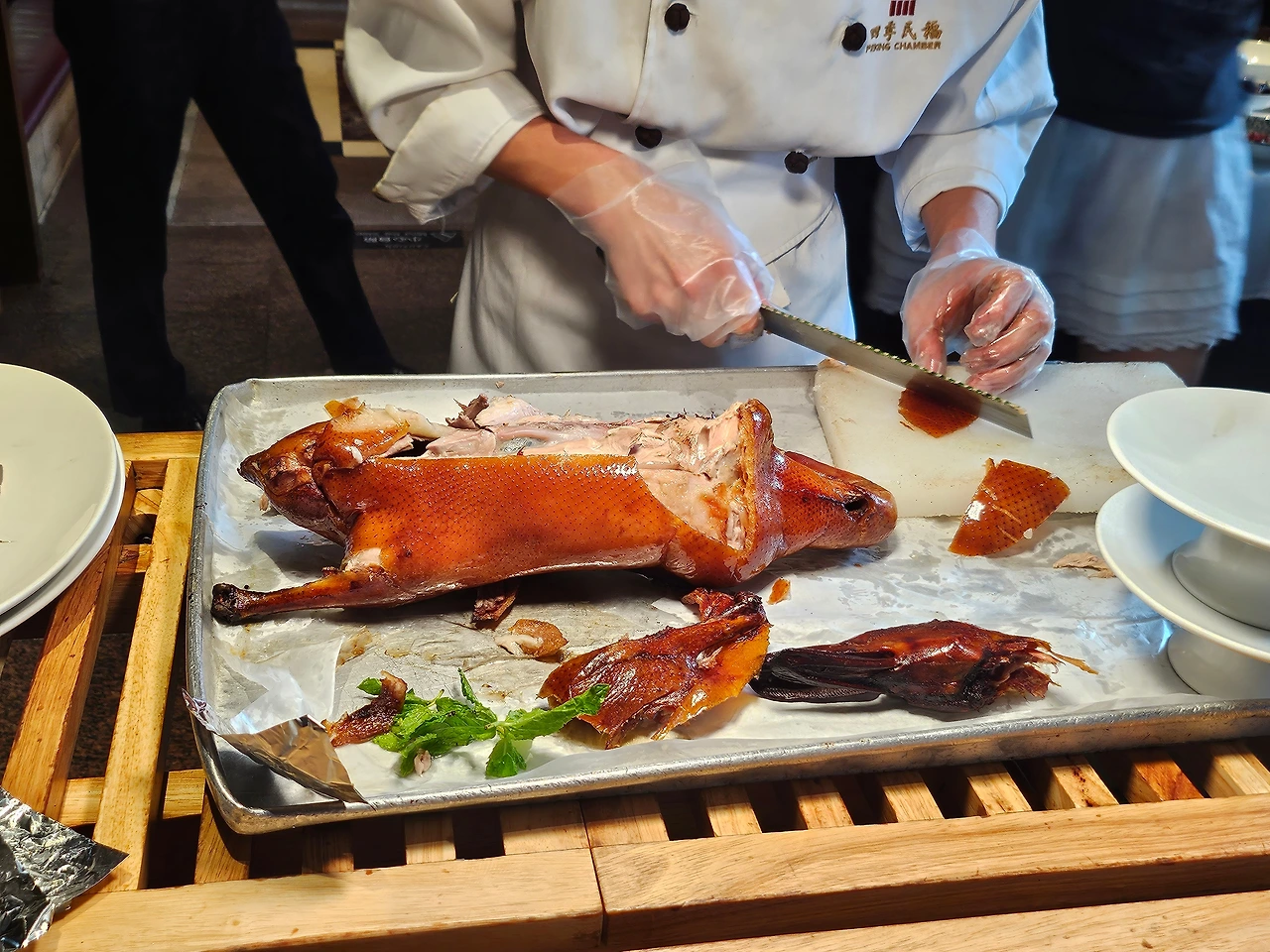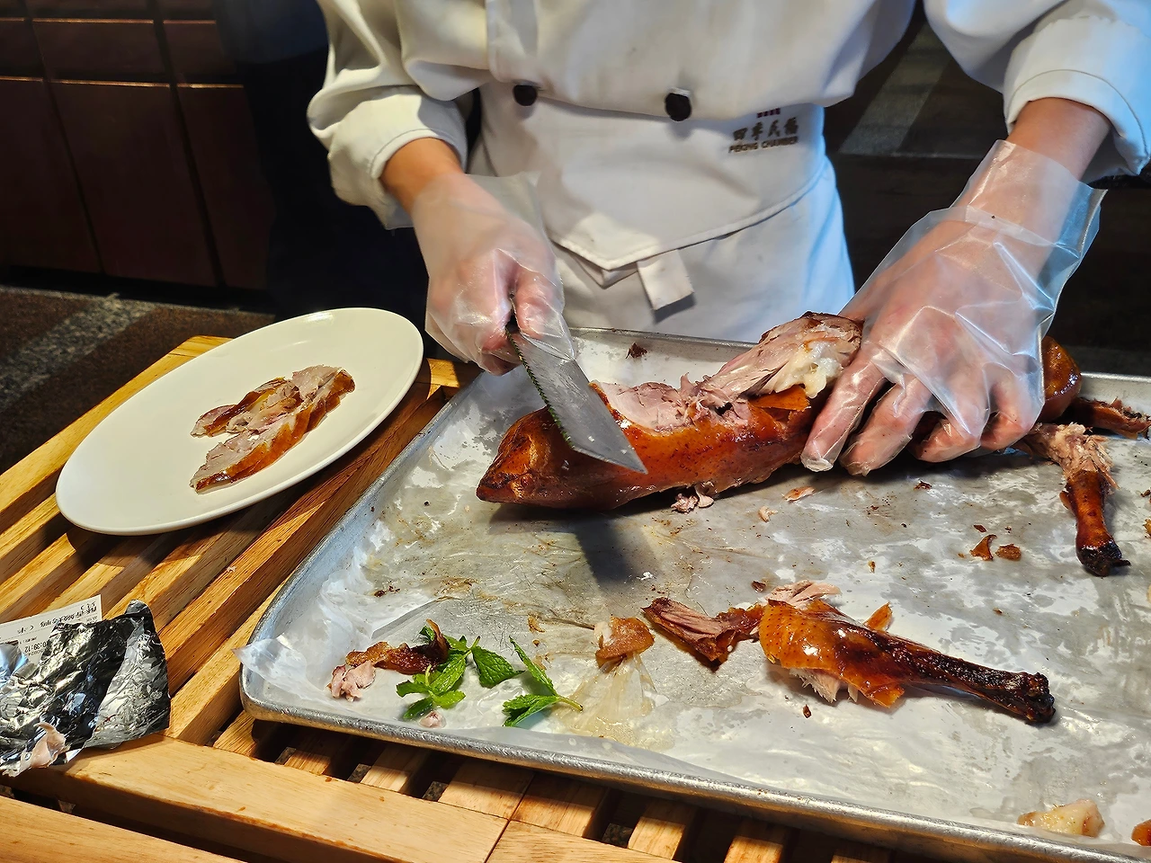 베이징 덕 요리의 묘미 중 하나는 직원의 칼질 퍼포먼스(?)를 구경하는 것이다. 직원은 '이 오리가 당신이 먹게 될 오리입니다'라는 손짓과 함께, 껍질과 살을 발라내는 작업을 시작한다. 북경 오리 요리의 핵심이 바로 식감을 살리는 손질이다.