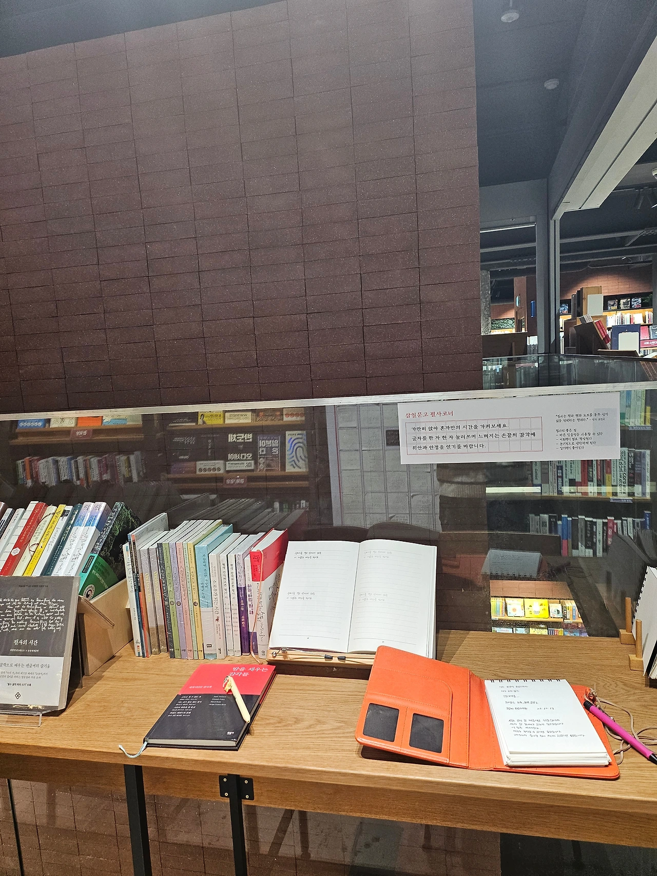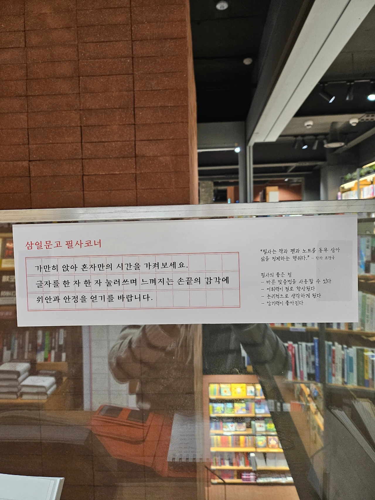 역시나 별다른 목적 없이 서점 문을 열었다. 잠깐 둘러보다 오늘따라 삼일문고 필사 코너에 시선이 갔다. 책상에는 필사하기 좋은 책들과 다이어리, 펜이 놓여있었다. 그리곤 이런 글귀가 눈에 들어왔다. "가만히 앉아 혼자만의 시간을 가져보세요. 글자를 한 자 한 자 눌러쓰며 느껴지는 손끝의 감각에 위안과 안정을 얻기를 바랍니다."