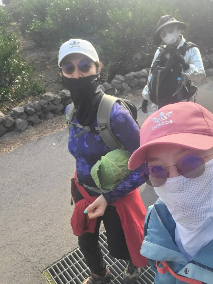 걷는 길에 도민 농부님이 주신 양배추 3개를 각각 하나씩 들고매고 왔음.