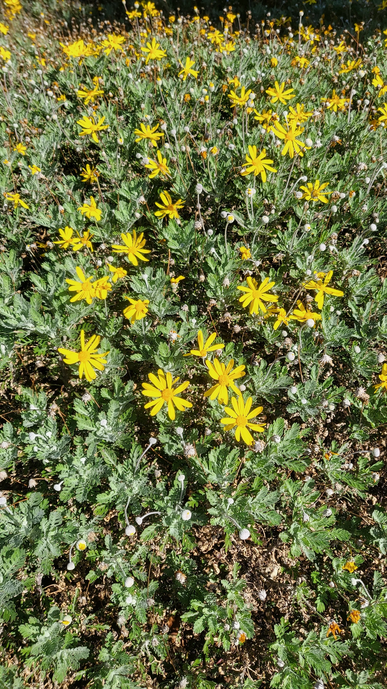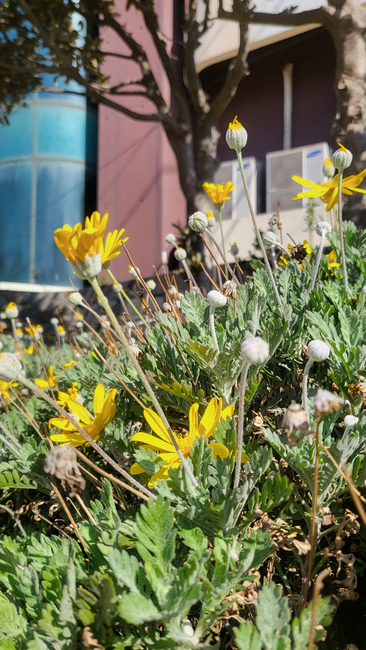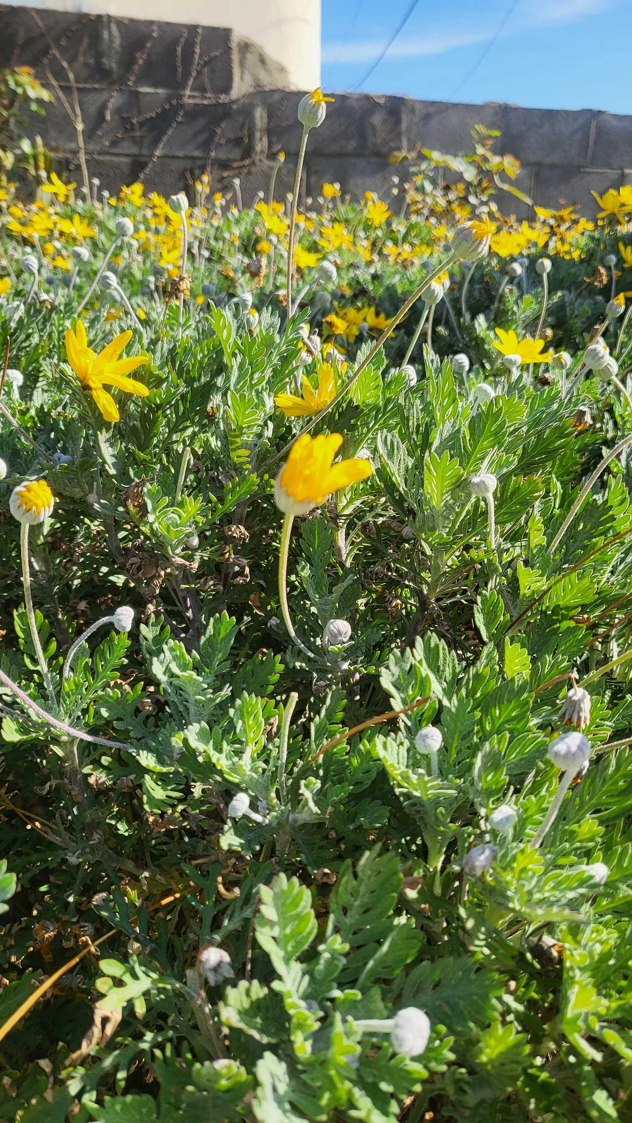 공중 화장실에 핀 꽃이 참 이쁘다. 처음 보는 꽃인데 꽃대가 길쭉하니 노란 왕관을 쓰고 있는 듯하다.