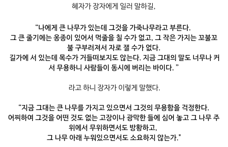 <장자>에 나오는 이야기의 현실판 같은 사실이다. 보통 '쓸모없는 나무'라는 제목으로 번역되는 이 이야기에는 수령과 키가 어마어마한 나무를 본 목수가 등장한다. 그러나 목수는 가지에 옹이가 많아 목재로는 가치가 떨어지는 '무가치한 나무'라며 그냥 지나친다. 그로부터 얼마 후, 이 나무는 목수의 꿈에 등장해 이렇게 묻는다. "저 유용한 나무들과 나를 비교하느냐?" 그리고 목수에게 과일나무와 목재용 나무는 결국 베인다는 사실을 지적한다. "옹이가 많은 것은 내게 아주 쓸모가 많다. 내게 다른 쓸모가 있었다면 내가 이만큼 크게 자랄 수 있었겠느냐?" 나무를 오로지 목재로만 바라보는 인간이 만든 쓸모와 가치의 구분을, 이 나무는 완강히 거부한다. "곧 죽게 될 쓸모없는 인간이여, 사물이 사물을 비난하는 데 무슨 의미가 있는가? 자네는 내가 쓸모없는 나무라는 것을 어떻게 안단 말인가?"