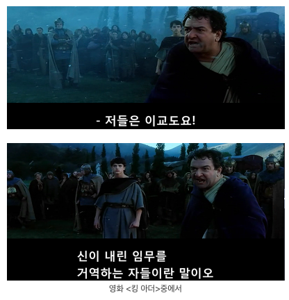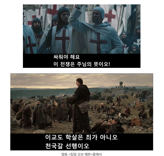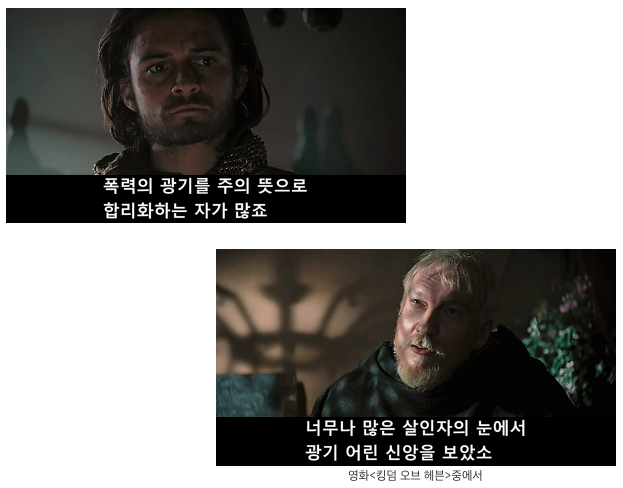 물론 종교적 정당화는 기독교의 전유물만도 아니다. 소위 '명예살인'도 알라의 이름으로 행하여지지 않나. '신의 이름으로', '국가의 이름으로' 등, '~의 이름으로' 정당화되는 무수한 살인들. 추상적이고 권위적인 존재 뒤에 은폐해 둔 권력자의 무수한 폭력성과 사리사욕들.