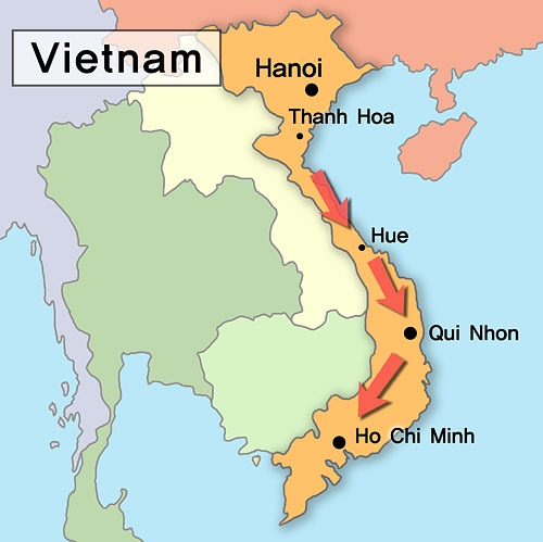 최북단에서 최남단까지 1,650㎞에 달한다. 동서 최장거리 600㎞, 최단거리가 48㎞이다. 서쪽에 산맥이 있고 동쪽에 바다가 있다. 전체 해안선의 길이는 약 3,260㎞이다. 베트남 영토는 흔히 알파벳 ‘S’ 형상이고 베트남 고유 지게인 “강(Ganh)”과 비슷하다고 한다.