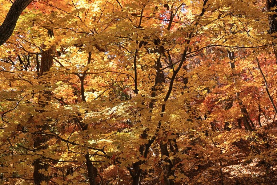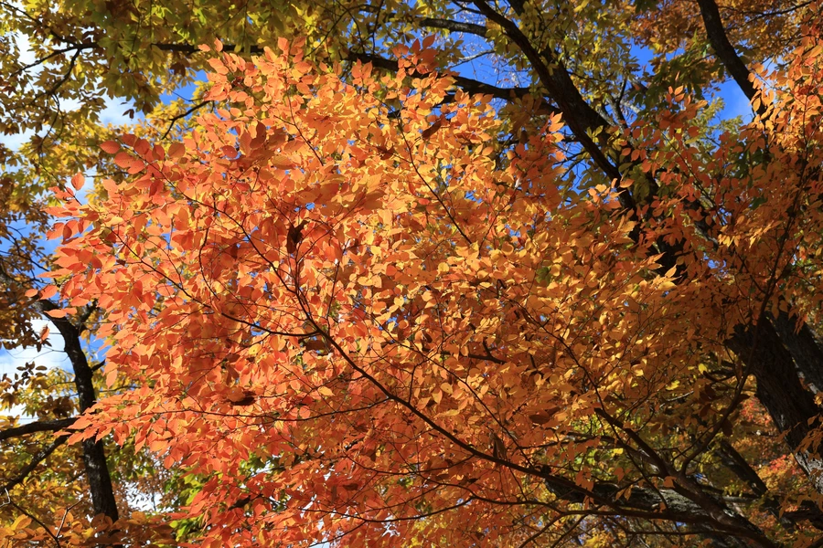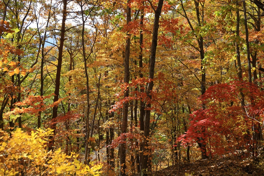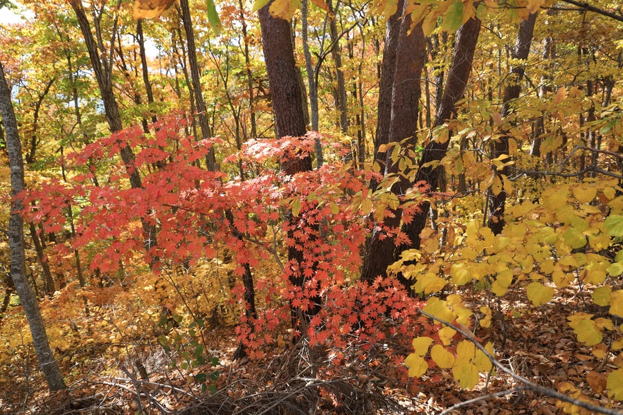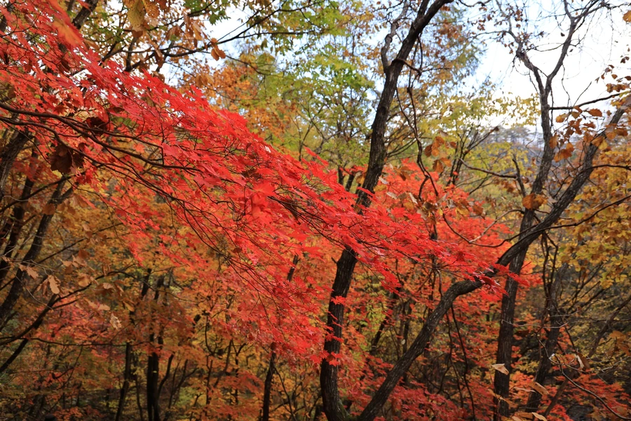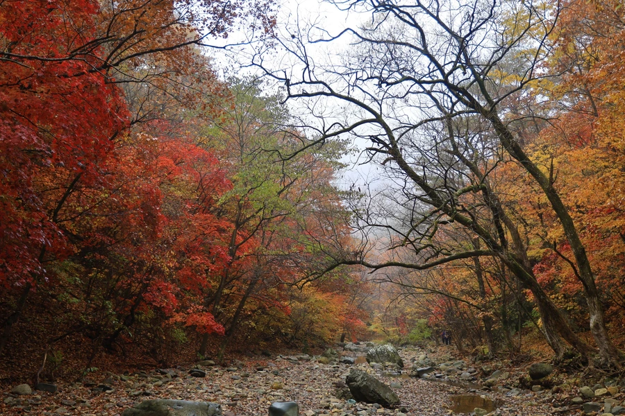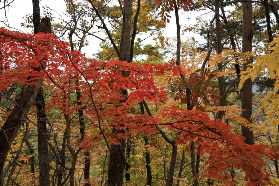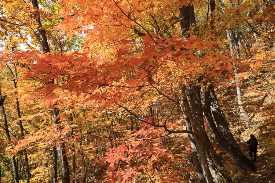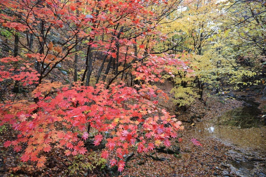 아! 제가 제일 좋아하는 나무인 서어나무였어요. 서어나무는 보통 노란색으로 물드는 것으로 알고 있었는데, 주왕산 서어나무는 붉은색~노란색으로 화려하게 물들었습니다.