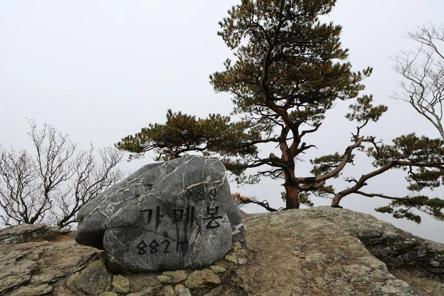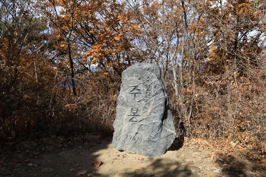 주봉 인증 사진을 겨우 찍었습니다. 대전사 - 주봉 코스가 계단이 많기는 하지만 짧은 코스라, 이곳으로 산행하는 사람들이 많아서 기다리는 줄이 길었어요. 다른 사람들 촬영하는 사이에 양해를 구하여 정상석만 겨우 찍고, 제 기념사진은 못 찍었네요.