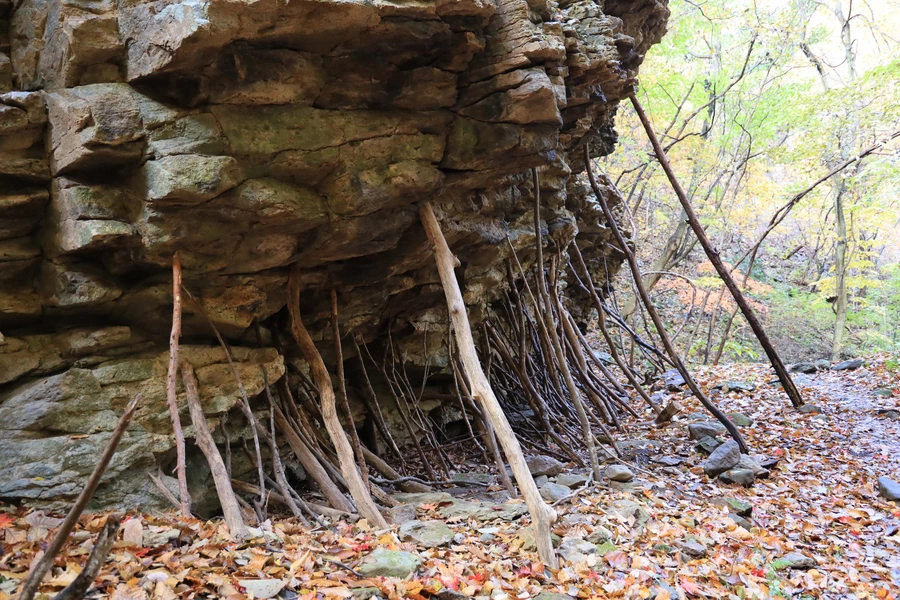 큰 바위 밑에 익살스러운 나무 지팡이 기둥. 누군가가 시작한 놀이에 너도나도 하나씩 동참한 것이겠지요.