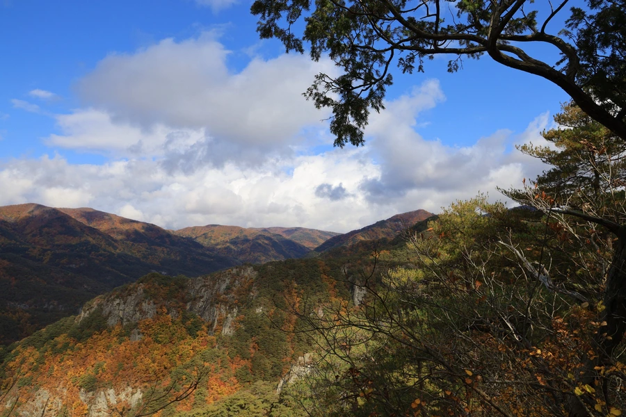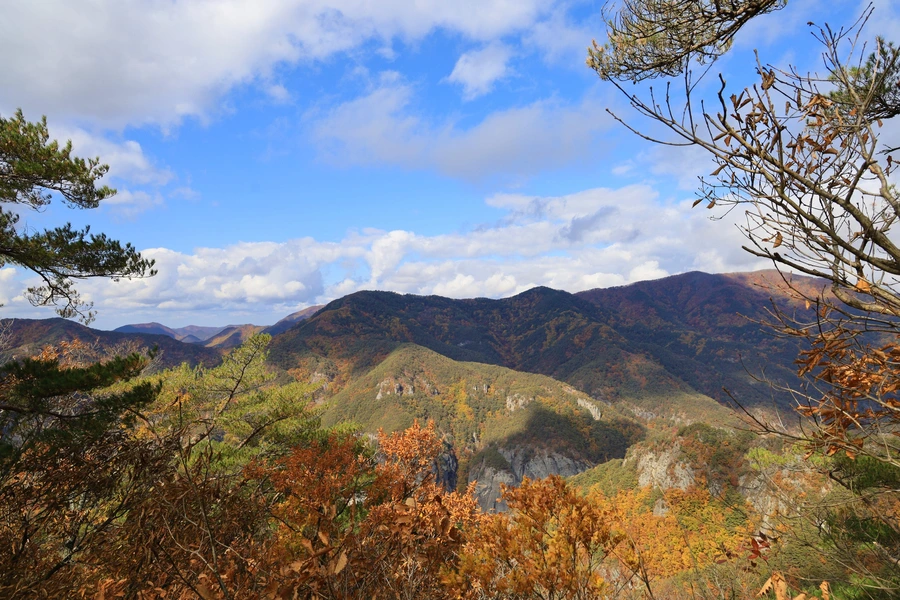 주봉을 지나 내려오는 길, 단풍은 절골이나 가메봉만큼 화려하지는 않네요. 하지만 하늘이 예쁜 구름을 데리고 와서 우리를 반겨줍니다. 도시락을 먹을 만한 장소를 찾지 못해서 그냥 내려가다가, 멋진 풍경이 보이는 자리에 자리를 잡고 겨우 점심을 먹었습니다.