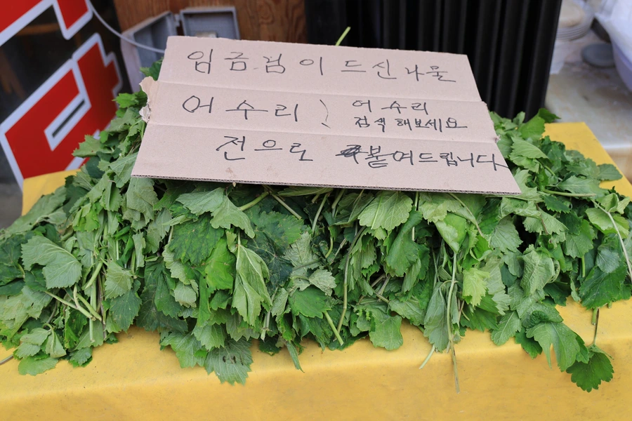임금님이 드신 나물이라는 어수리를 펼쳐놓고 손님을 부르는 식당도 있네요.