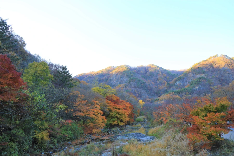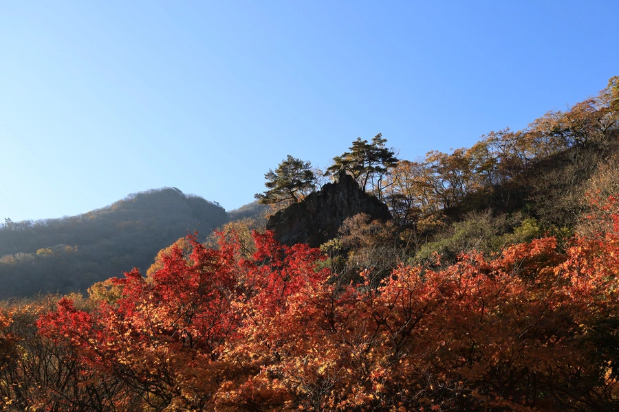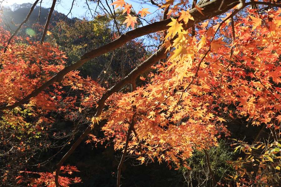 산꼭대기에는 해가 비치지만, 아래쪽은 광선이 부족하여 단풍색이 선명하지 않은데도 화려함을 뽐내고 있습니다.