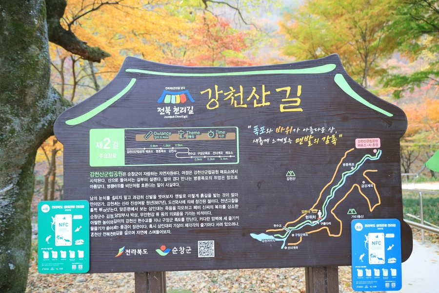 '폭포와 바위가 아름다운 산' 강천산 길은 전북천리길의 한 구간이기도 합니다. 흙길이라 맨발로 걷는 경험을 해 보라고 권하는군요.
