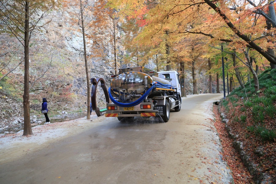 우리가 강천산 단풍 트레킹을 편안하게 할 수 있는 이유는 바로 부지런히 길을 관리해 주시는 분들 덕분입니다. 낙엽을 송풍기로 날리는 분들을 봤어요. 낙엽만 깨끗이 쓸어내는 것이 아니라 쓰레기도 줍고 다니시더군요. 포장이 안 된 도로라 사람이 많이 모이면 먼지가 발생하기 쉬운데, 쾌적하게 걸을 수 있게 아침부터 물을 뿌리고 다니는 살수차도 여러 대 만났습니다.
