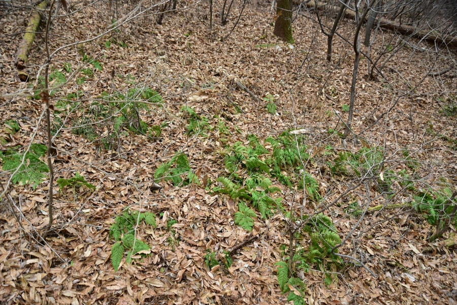 계절과 관계없이 기온에 민감하게 반응하는 식물이 바로 양치식물입니다. 반짝 추위 때는 납작 엎드려 있다가, 잠깐 기온이 오른 사이 초록초록해진 모습이 예쁘네요. 녹색이 거의 없는 숲길에서 가끔 만나는 반가운 모습입니다.