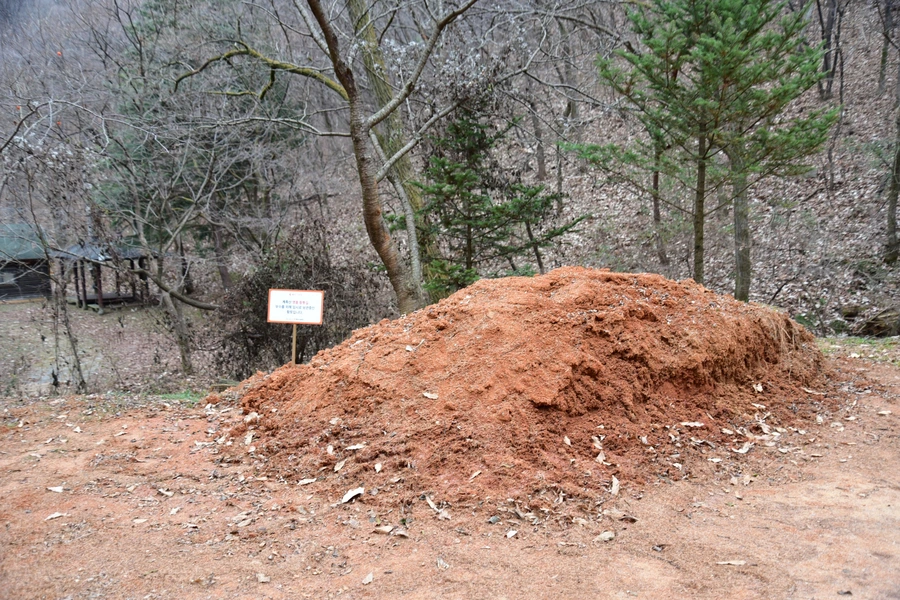 명품 황톳길 보수를 위해 항시 대기 중인 황토 더미.