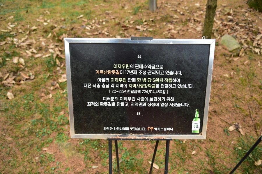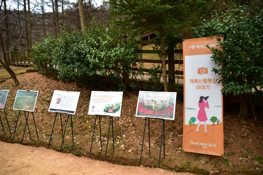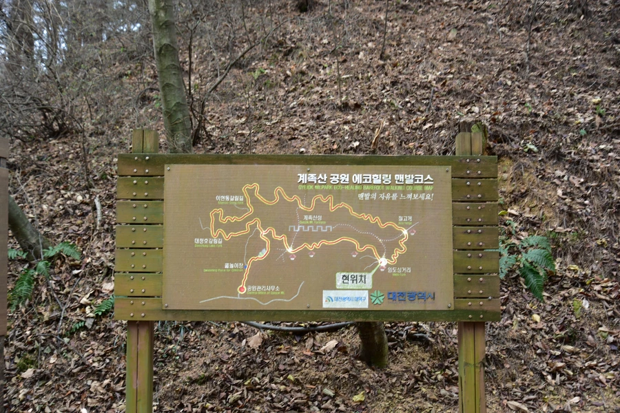 대전의 동쪽인 대덕구에 위치한 계족산은 높이 423.6m의 낮은 산으로 성재산, 금병산, 우산봉, 갑하산까지 다섯 봉우리가 둥그렇게 이어져 산줄기가 닭발처럼 퍼져 나갔다 하여 이름이 붙여졌다고 합니다. 백제시대의 산성인 계족산성이 있구요, 황톳길 걷기 길이 조성되어 있어 맨발로 걷는 길로 유명한 곳입니다. 총 길이 14.5km의 계족산 황톳길은 연간 100만 명 이상이 찾는다고 하더군요. 정식 명칭은 대전둘레산길이며, 2022년 11월에 산림청에서 관리하는 국가숲길로 지정되었으며, 한국 관광 100선에 4회 연속 선정되었다고 하네요.