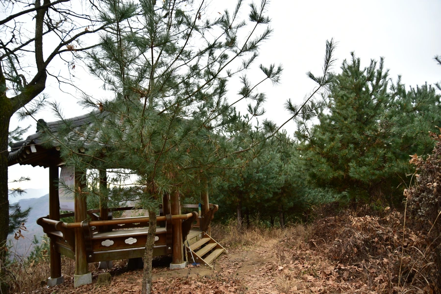 뜻밖에 푸른 잣나무 숲 사이의 정자를 만납니다. 온통 갈색인 12월 초의 산에서 푸른색은 언제나 반가움입니다.