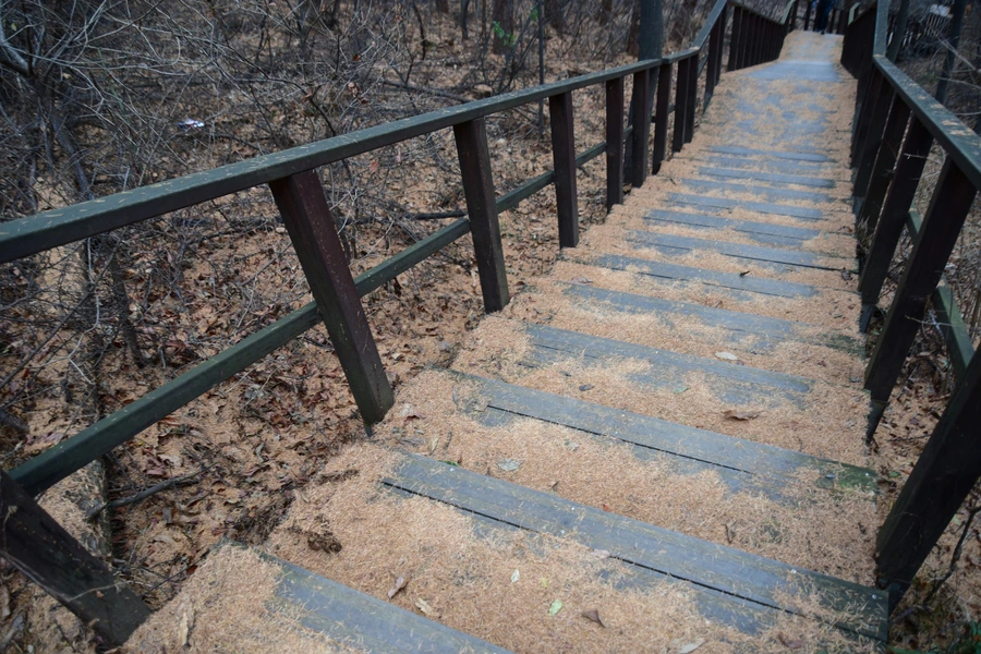 낙엽송 잎이 부드럽게 쌓여 마음까지 포근하게 만듭니다. 이 긴 계단길도 끝은 있지요.