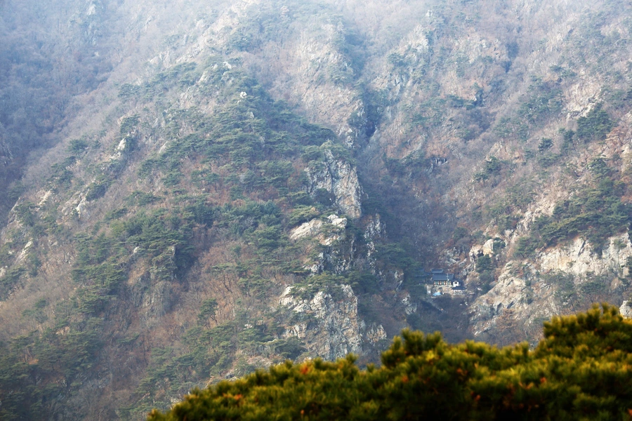 산 중턱에 절이 보인다.