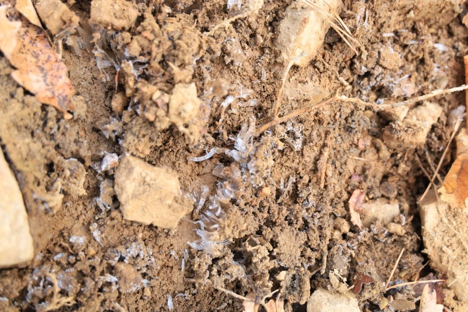 영하이긴 하지만 날씨가 별로 춥지 않은데, 바닥에는 얼음이 보인다. 서릿발이다.