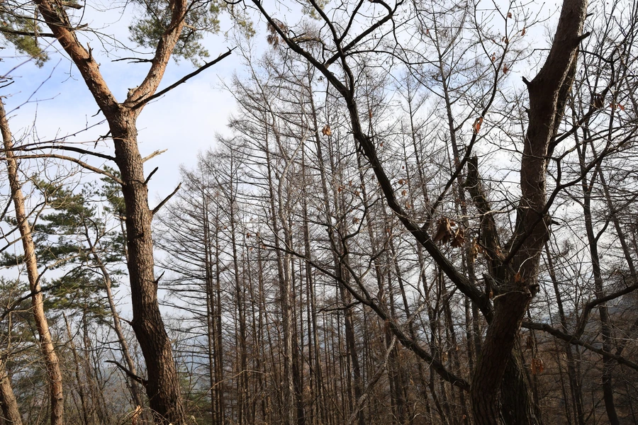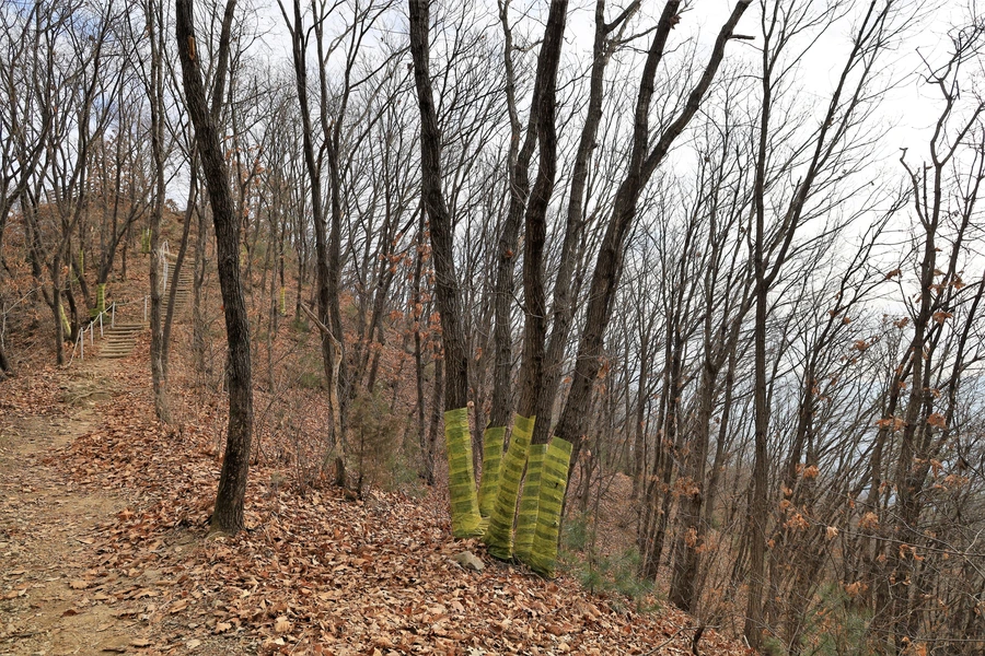 관악산에도 검정 비닐 옷을 입은 참나무를 많이 보았는데, 이곳에는 연두색 비닐 옷이다. 참나무 시들음병을 방제하기 위한 끈끈이 트랩이라고 한다.