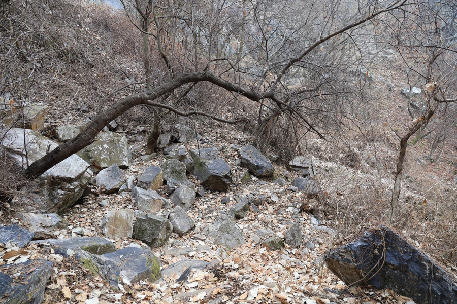 거친 바위가 쏟아지듯 흩어져 있다. 옛날 옛적 어느 시대에 암석이 많은 산의 일부가 천재지변이나 풍화 작용에 의해서 낙석처럼 부서져 내린 것이 아닌가 싶다.
