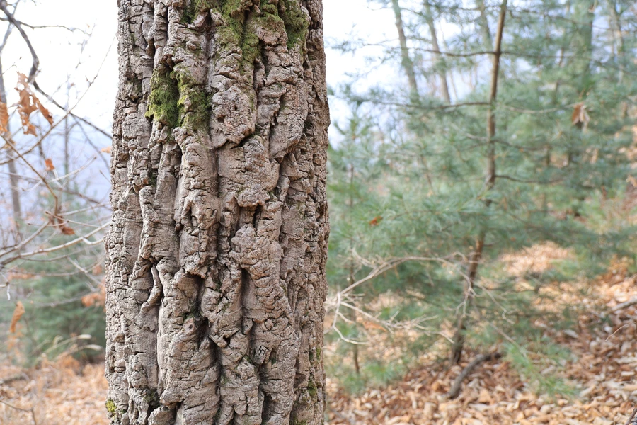 수피가 특징있는 굴참나무와 낙엽진 굴참나무 잎들.