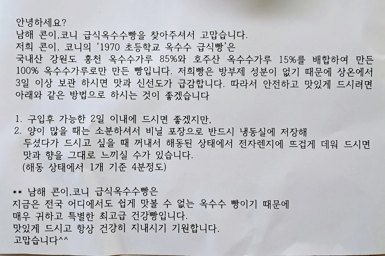 맛은 좀 달랐지만, 추억 소환하기에는 충분하였다. 아버지의 옥수수빵은 아무래도 밀가루와 섞어서 만드신 것 같다. 돌아가신 지 한참 되었으니 레시피를 물어볼 수도 없고. 맛은 추억의 껌딱지처럼 입에 기억되어 있으니, 나도 남해에 있다는 그 빵가게 사장님처럼 내 추억의 맛을 재현하려 다시 시도해 봐야겠다.