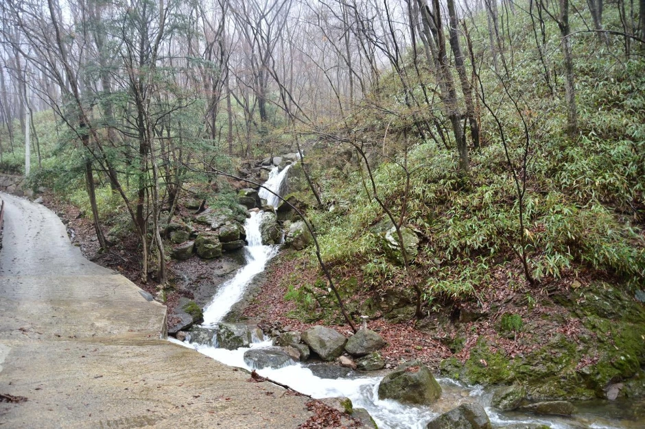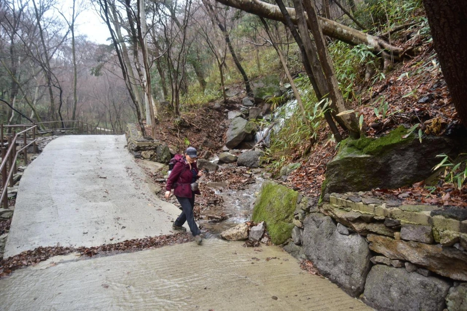 비가 많이도 왔나 보다. 높은 곳에는 아래로 흘러내리는 물이 작은 폭포를 그려내고, 개천은 여름날 계곡물처럼 힘차게 흐른다. 운문암으로 가는 길도 포장되지 않았으면 걷기 힘들 정도로 물이 흐르는 구간을 발견하기 어렵지 않다. 산행객은 우리뿐이라 여유롭긴 하다. 비가 서서히 그치는 것 같아 우산은 접었다.