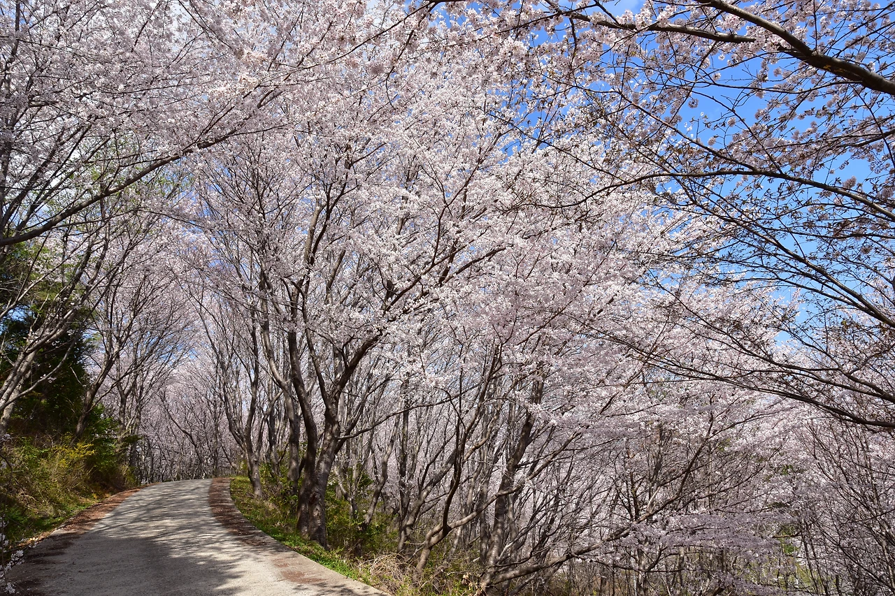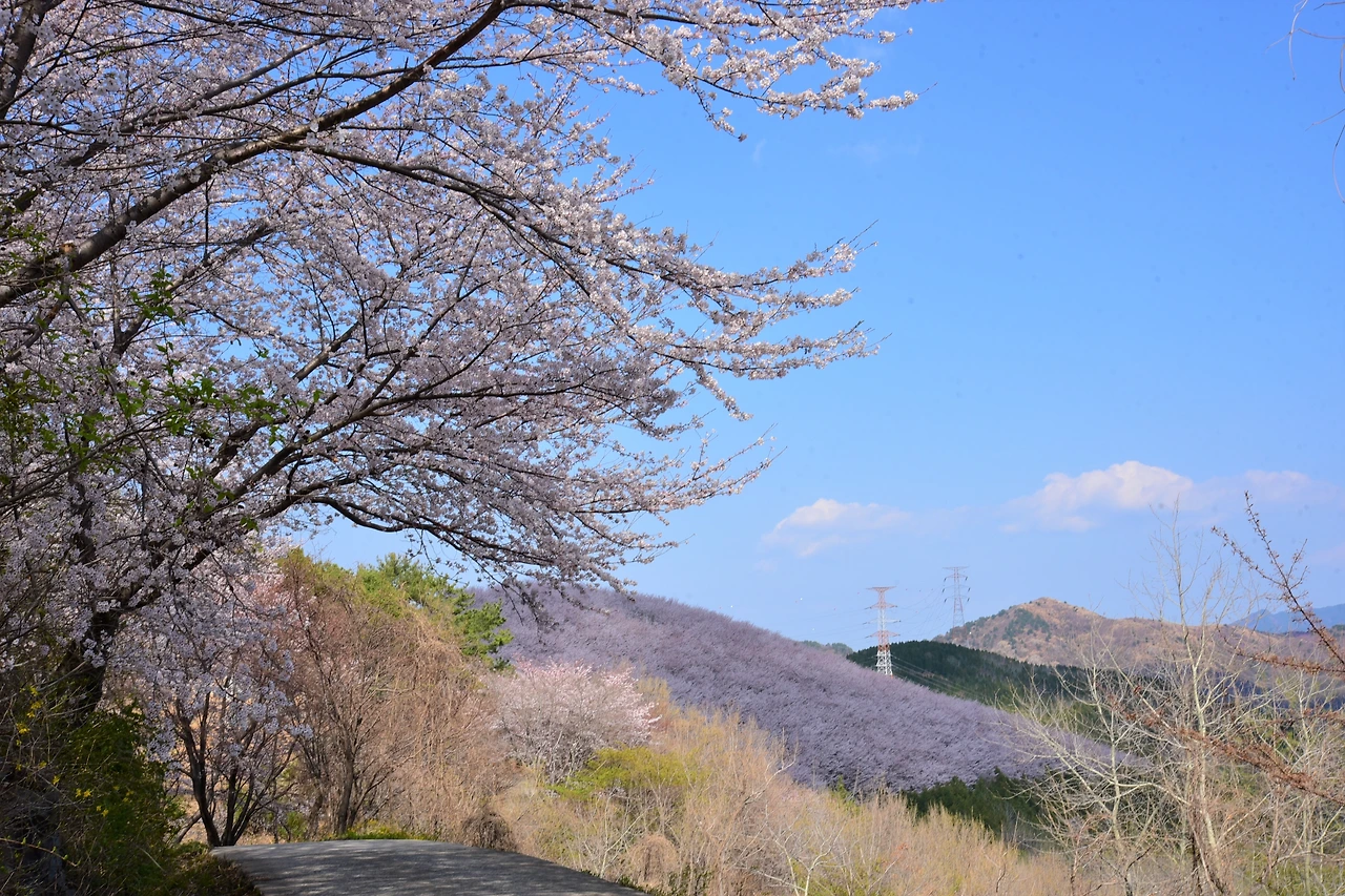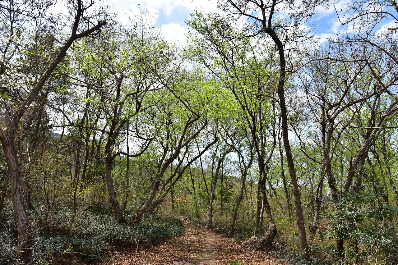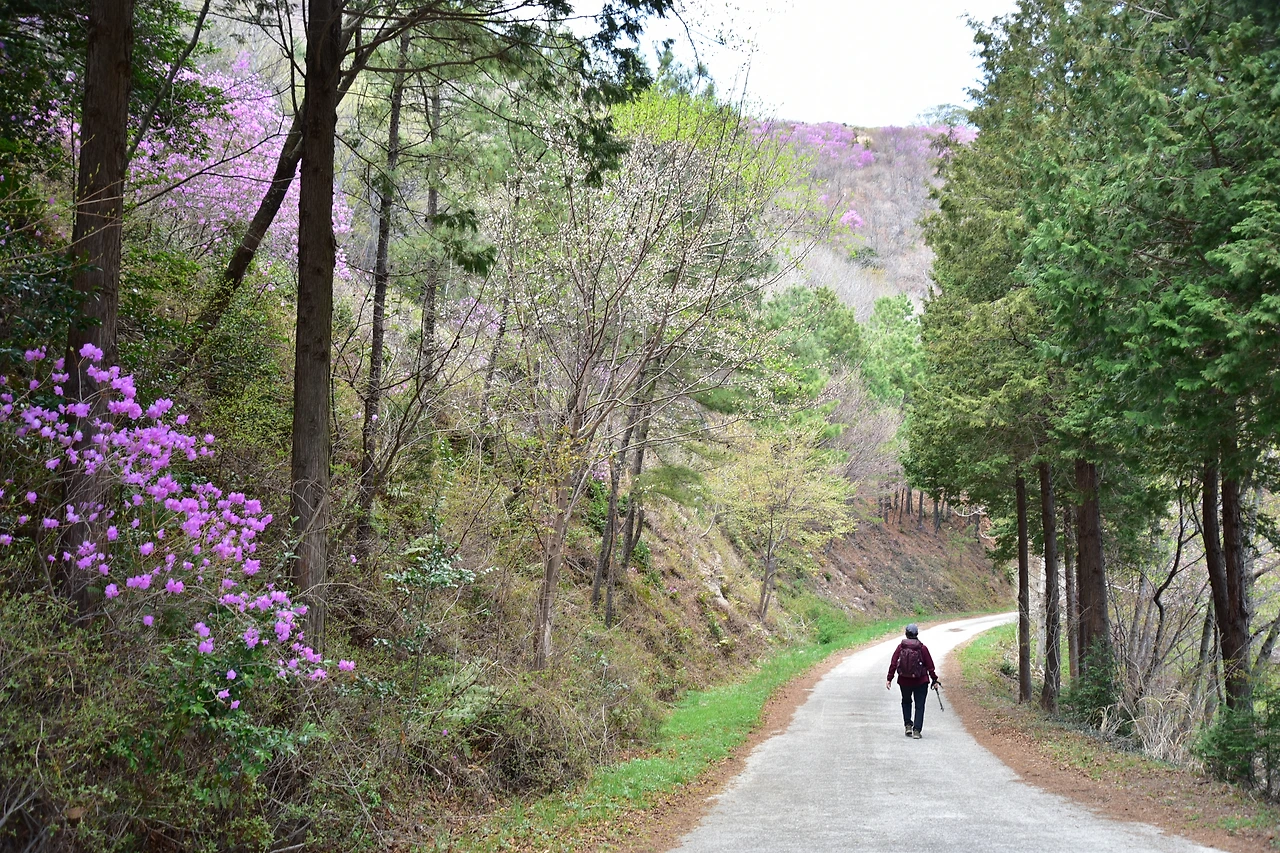 내려오는 길 노란 개나리와, 연두색 새순과 분홍색 진달래가 묘하게 어울리는 구간이 있었다. 산행객 사이에 많이 알려진 뷰 포인트라고 한다. 사유지로 보이는 곳에 벚꽃이 한창이었다. 골명치를 지나 돌고개 쪽으로 하산한다.