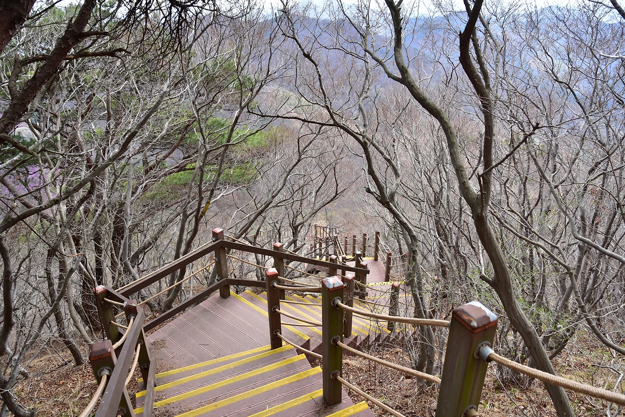 산을 오르면 우선 시원한 바다가 보인다. 정유 공장이라 하얀색 원통형 저장고가 꽤 많이 보인다. 원유가 가득 담겨있는 건가 짐작해 본다. 우리나라 산업이 원활하게 움직이게 하는 에너지의 원동력이 되는 것이겠지. 아침보다 구름의 양이 많아졌다. 덩어리 구름 사이로 해가 숨바꼭질한다. 사진 찍을 때 빛이 있어야 잘 나올 텐데. 하지만 사진작가들처럼 마냥 기다리고 있을 수는 없다. 우리는 산행객이니까. 진달래는 우리 민족 정서와 매우 가까운 꽃이다. 우리나라 어느 산이고 지천으로 피어서 봄 하면 진달래를 연상하게 되는데, 특이하게 산꼭대기에 군락을 이루어 산 전체를 붉은 꽃빛으로 장식하는 장관을 연출하는 산들이 있어서, 많은 사람들이 산을 올라야 볼 수 있는 그 모습을 보려고 낑낑대며 올라가기를 서슴지 않는다. 우리는 시니어 천천히 산행팀이다. 산에 가면 우리 같은 나이의 부부 산행객을 만나기는 쉽지 않은 편이다. 나잇대가 좀 있어 보이는 남자분들이 여럿 어울려 다니는 경우는 쉽게 볼 수 있지만 대부분 젊은 사람들이 많아서 스틱 없이도 씩씩하게 잘 다니는 모습이 보기 좋다. 우리는 스틱을 자주 사용한다. 어떤 때는 평길에 가까운 트레킹 코스에서도 사용하기도 한다. 스틱을 사용하지 않고 걸을 때보다, 스틱을 사용하게 되면 경사가 급한 산에서 훨씬 수월하게 걸을 수 있다. 영취산 능선에는 계단 설치 구간이 많은데, 계단을 오르내릴 때도 스틱의 도움을 많이 받는다. 진달래는 키가 별로 크지 않는 교목이지만, 산 위의 오래된 진달래들은 제법 키가 커서 꽃 터널을 만들기도 한다. 색도 자세히 보면 한 가지 색이 아니라 여러 가지 색이다. 햇빛을 많이 받으면 더 진한 색이 되는 건지. 연분홍과 진분홍의 진달래들이 내가 더 예쁘다고 빛깔 자랑을 한다.
