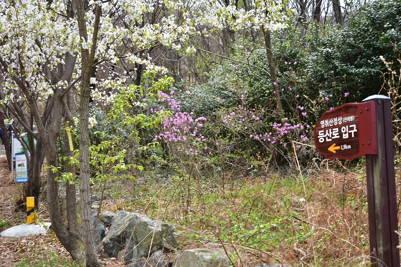 사실 쉬운 길보다는 힘들여 산을 올라 그 귀한 진달래 군락을 만나는 감동을 느끼고 싶어서 영취산을 가게 된다. 쉬운 수학시험 100점 받는 것보다 어려운 수학 시험 90점 받는 기쁨이 더 큰 것과 같은 것이다. 시기를 맞추기가 참 어렵다. 가까이 사는 사람도 산에 올라가 봐야 알 수 있는 걸 멀리서 알 수 없는 법인데. 꼭 피크 아니라도 괜찮다고 했지만, 맘먹고 내려가는 건데 이왕이면 만개가 좋다. 산이란 하도 지역이 넓어서 전체로 덜 피어 보여도, 어느 쪽에는 활짝 핀 진달래를 만날 수 있다는 것은 큰 다행이다. 여수 산업단지 도착이 12시 30분쯤. GS 칼텍스 후문 건너편에 위치한 돌고개 주차장에 주차를 했다. 시간 상으로 오전에 올라간 등산객들의 차가 빠지는 시간이라 자리는 넉넉했다. 등산로 입구에 예쁘게 핀 산벚나무 몇 그루가 우리를 맞이한다. 약간 경사가 있는 오르막으로 500m 정도 올라가야 한다. 숲 양쪽으로는 남쪽 끝 동네답게 봄 색이 완연하다.
