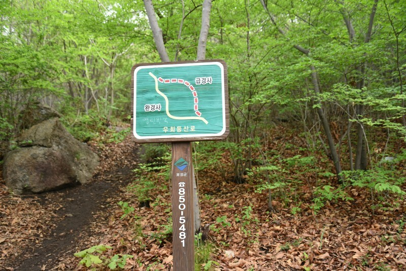 완경사, 급경사 두 갈래 길을 만난다. 올라가서 보니 계단이 있으면 급경사이고, 없으면 완경사다. 완경사로 올라가는데 경사가 급한 건 마찬가지라 웃었다. 다음에는 그냥 급경사로 가기로 했다. 만사형통 스틱이 있으니까.