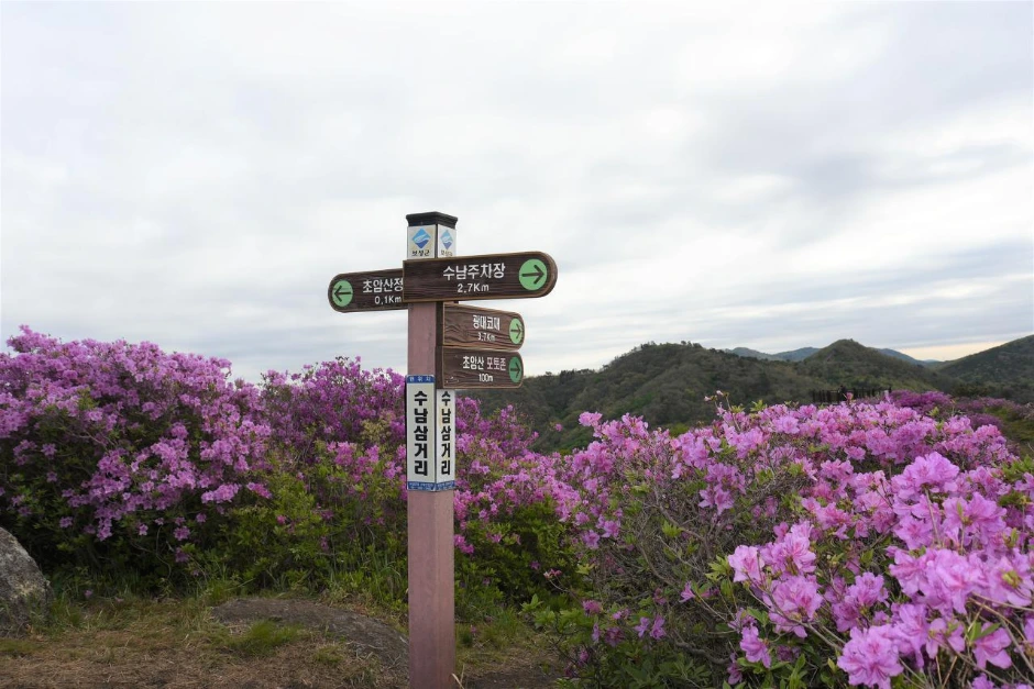 초암산 주차장에서 상까지는 2.8km인데, 보통 정상까지 갔다가 되돌아오는 등산객들이 많다. 오르막의 연속이긴 하지만 거리가 짧은 편이고 정상의 높이가 576m이기 때문에 큰 부담 없이 다녀올 수 있는 철쭉 명산이다. 올라가는 동안, 벌써 갔다가 내려오는 등산객도 있었다.