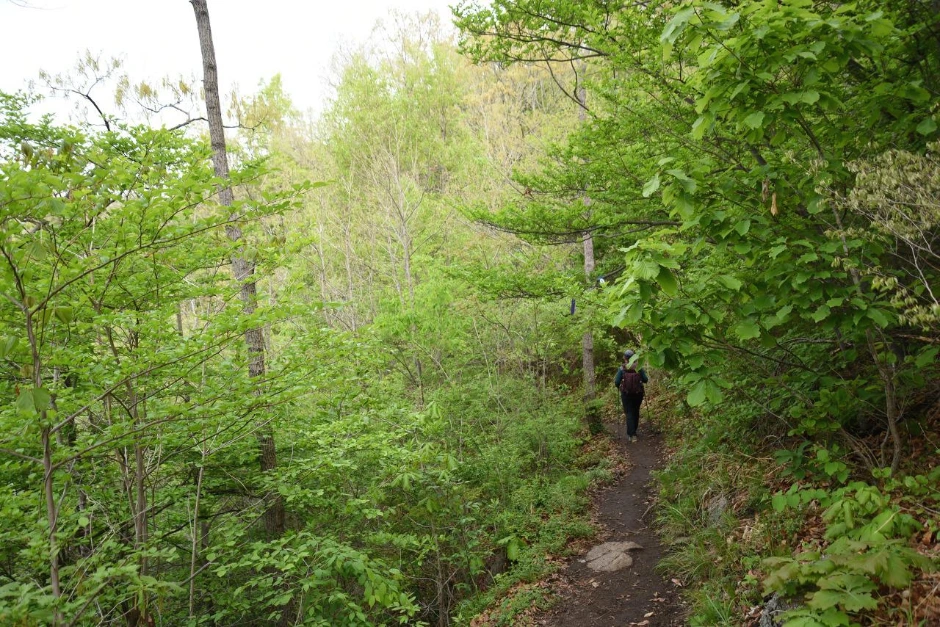요즘 산은 어딜 가나 녹색길이다. 연한 녹색의 어린 나뭇잎 색이 가슴을 두근거리게 만드는 숲길이다.
