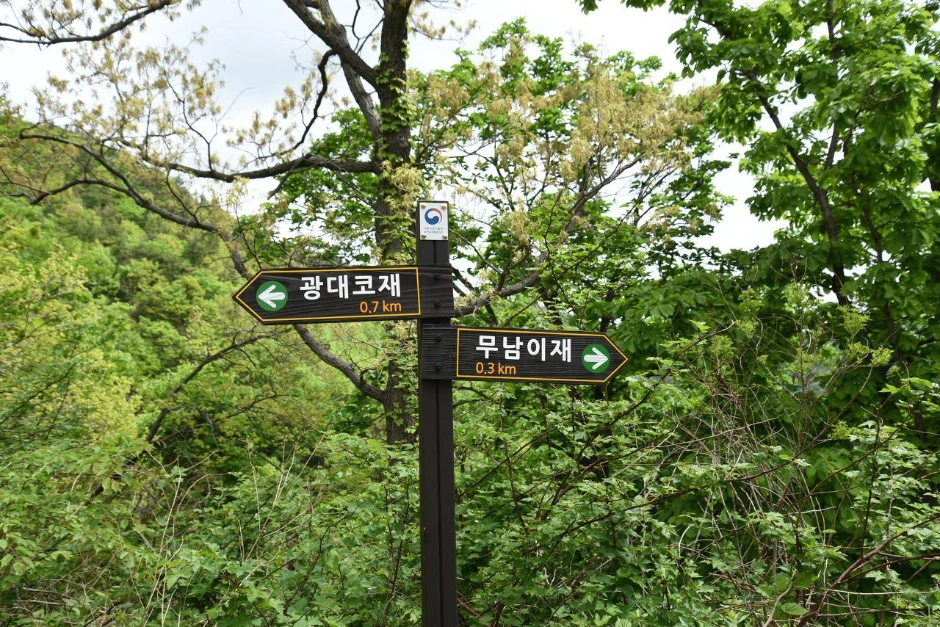 철쭉꽃 속의 이정표는 더 행복하겠다. 이정표에서 우리가 내려갈 방향인 광대코재를 확인한다.