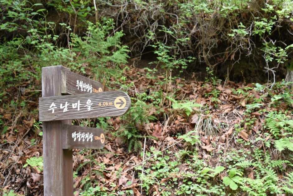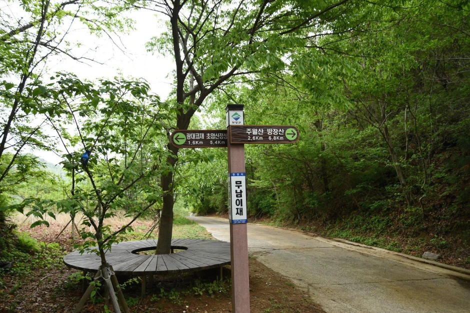 무남이재에서 임도로 연결이 된다. 산길로 직진하면 주월산 - 방장산으로 연결되는 종주 등산로가 되는데, 총 16km라고 한다. 우리도 처음에는 그 코스로 산행하려고 했으나, 다음날 다른 산행이 계획되어 있어서 오른쪽 길인 윤제림으로 내려가기로 했다. 평길이지만 수남 마을까지 4km다.