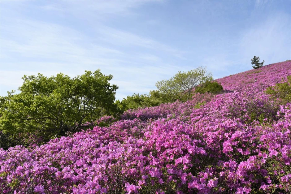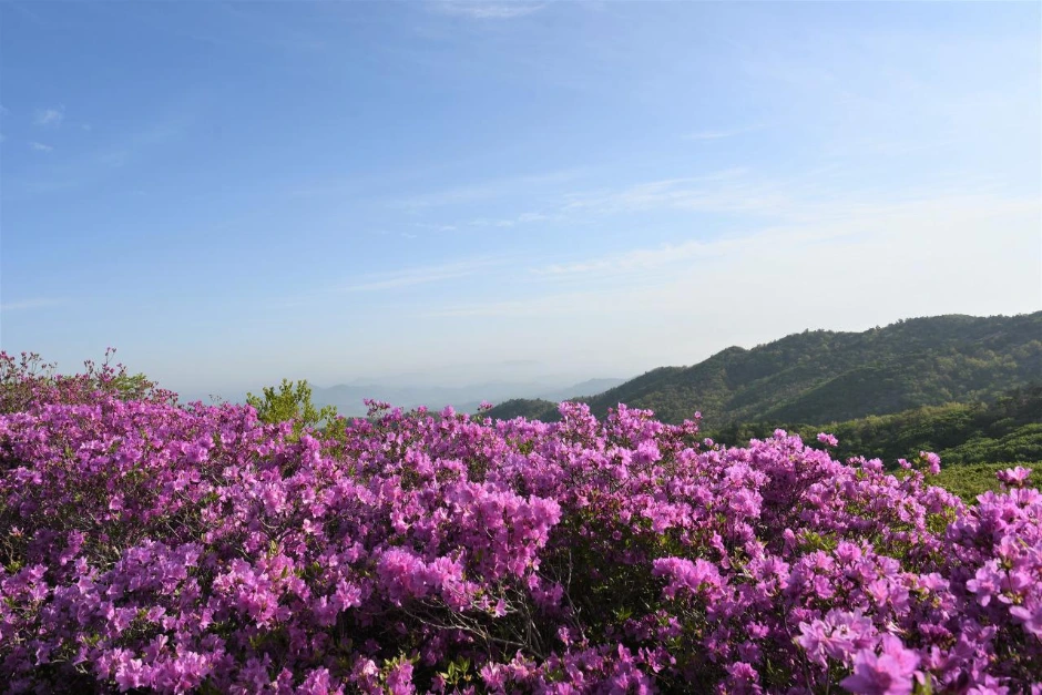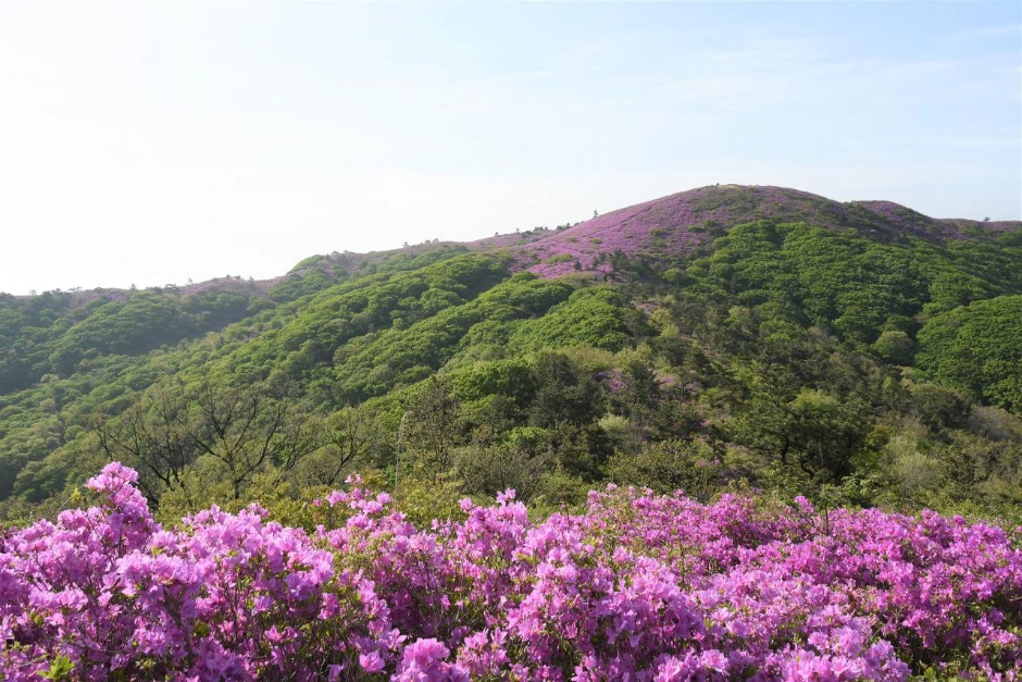 녹색 그라데이션과 철쭉. 산등성이가 빨갛게 물들었다.