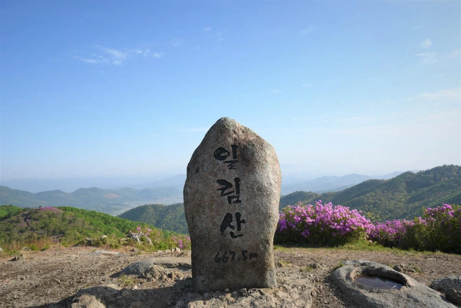 꽃 터널을 누비며 올라가서 일림산 정상석과 만났다. 일찍 갔기 때문에 당연히 정상석 차지가 쉽다. 피크기에는 정상석 앞에 길게 줄 서는 일이 보통이다. 토요일과 달리 파란 하늘을 실컷 배경으로 담을 수 있었다.