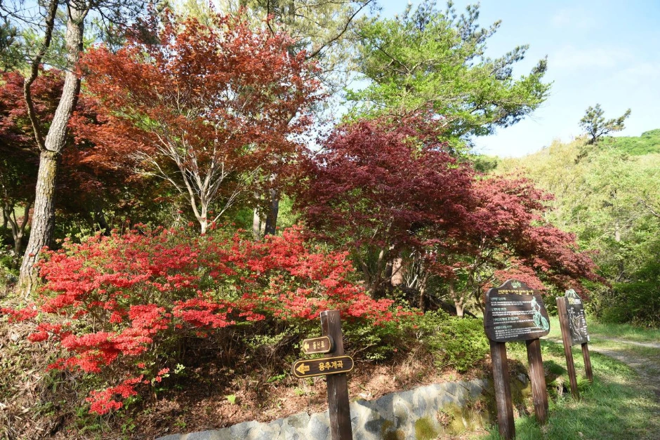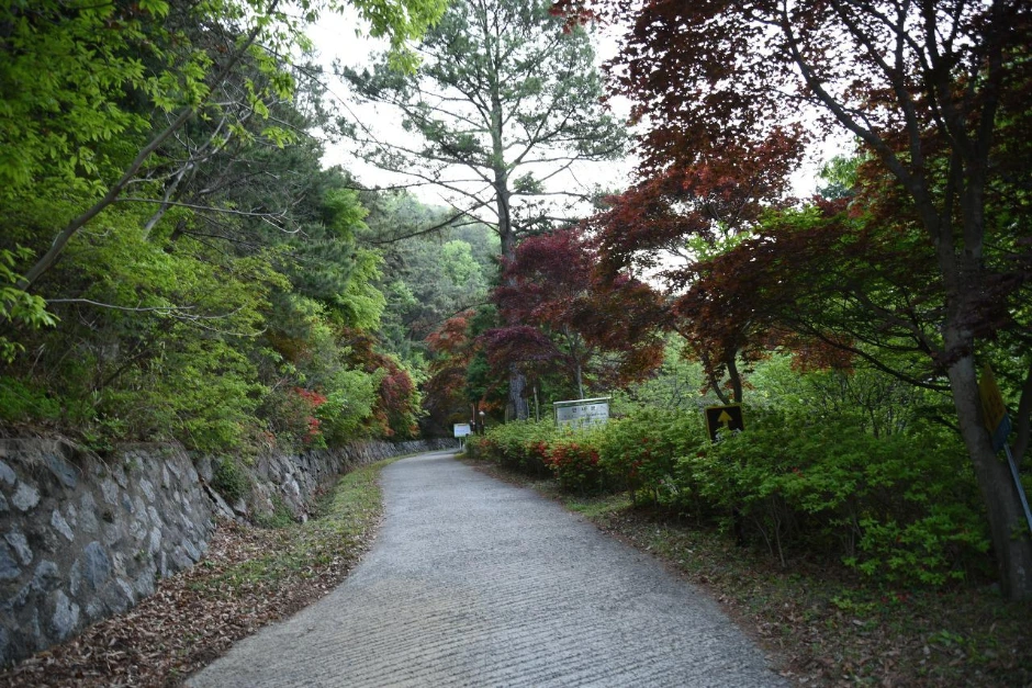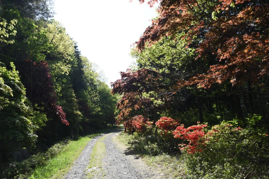 두 번째 임도는 화려했다. 홍단풍과 빨강 영산홍이 주위를 환하게 만든다. 약수터가 있었지만 음용불가라고 되어있다. 마실 물은 항상 가지고 다닌다.